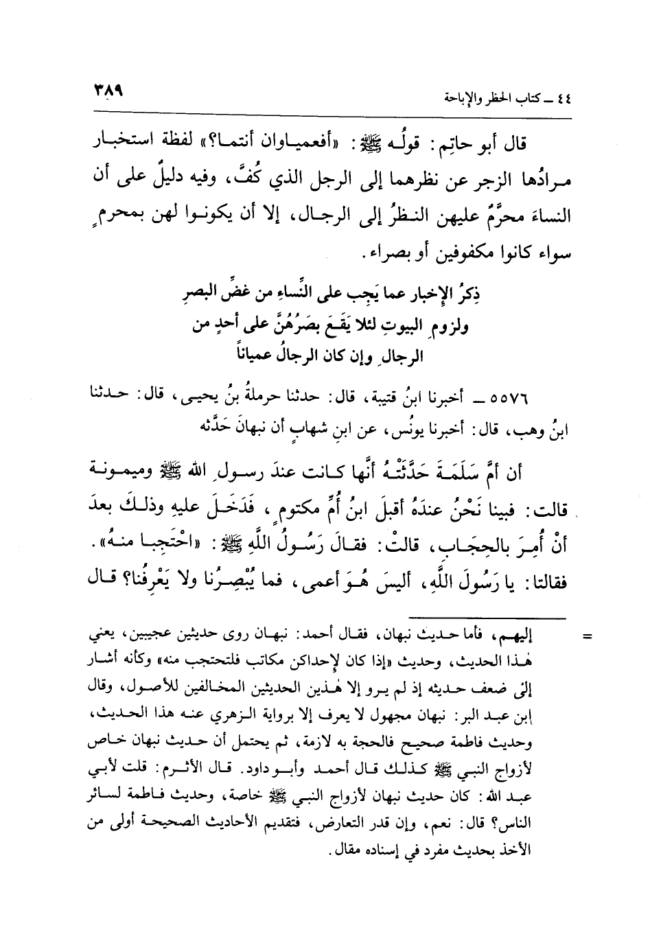 5576 - أَخْبَرَنَا ابْنُ قُتَيْبَةَ، قَالَ: حَدَّثَنَا حَرْمَلَةُ بْنُ يَحْيَى، قَالَ: حَدَّثَنَا ابْنُ وَهْبٍ، قَالَ: أَخْبَرَنَا يُونُسُ، عَنِ ابْنِ شِهَابٍ، أَنَّ نَبْهَانَ، حَدَّثَهُ أَنَّ أُمَّ سَلَمَةَ حَدَّثَتْهُ أَنَّهَا كَانَتْ عِنْدَ رَسُولِ اللَّهِ صَلَّى اللَّهُ عَلَيْهِ وَسَلَّمَ وَمَيْمُونَةُ، قَالَتُ: فَبَيْنَا نَحْنُ عِنْدَهُ أَقْبَلَ ابْنُ أُمِّ مَكْتُومٍ، فَدَخَلَ عَلَيْهِ، وَذَلِكَ بَعْدَ أَنْ أُمِرَ بِالْحِجَابِ، قَالَتْ: فَقَالَ رَسُولُ اللَّهِ صَلَّى اللَّهُ عَلَيْهِ وَسَلَّمَ: «احْتَجِبَا مِنْهُ» فَقَالَتَا: يَا رَسُولَ اللَّهِ: أَلَيْسَ هُوَ أَعْمَى فَمَا يُبْصِرُنَا وَلَا يَعْرِفُنَا، قَالَ