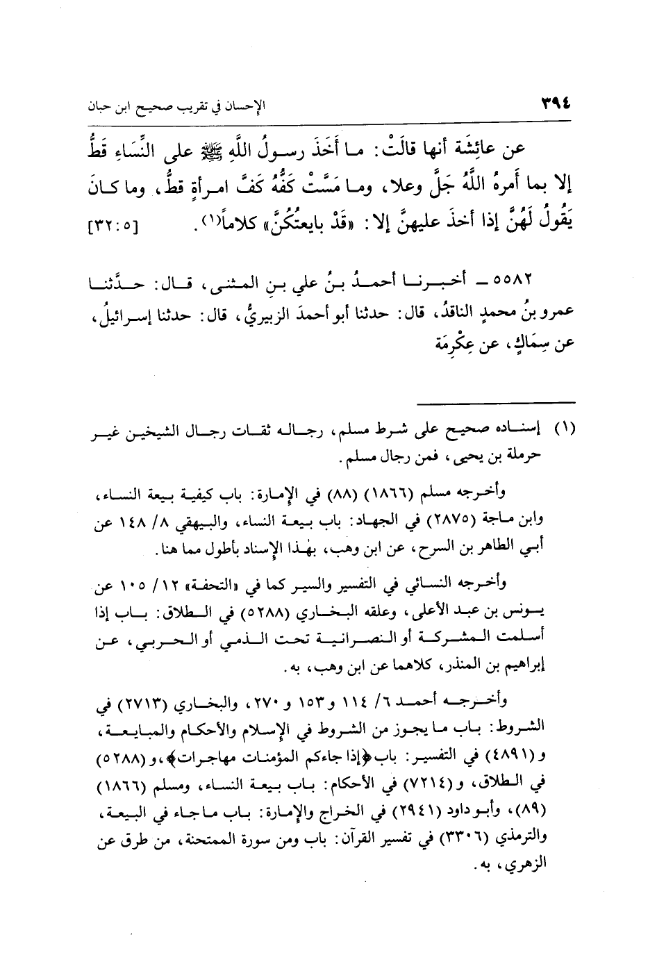 عَنْ عَائِشَةَ، أَنَّهَا قَالَتْ: مَا أَخَذَ رَسُولُ اللَّهِ صَلَّى اللَّهُ عَلَيْهِ وَسَلَّمَ عَلَى النِّسَاءِ قَطُّ إِلَّا بِمَا أَمَرَهُ اللَّهُ جَلَّ وَعَلَا، وَمَا مَسَّتْ كَفُّهُ كَفَّ امْرَأَةٍ قَطُّ، وَمَا كَانَ يَقُولُ لَهُنَّ إِذَا أَخَذَ عَلَيْهِنَّ إِلَّا قَدْ بَايَعْتُكُنَّ كَلَامًا (¬1) . [5: 32]