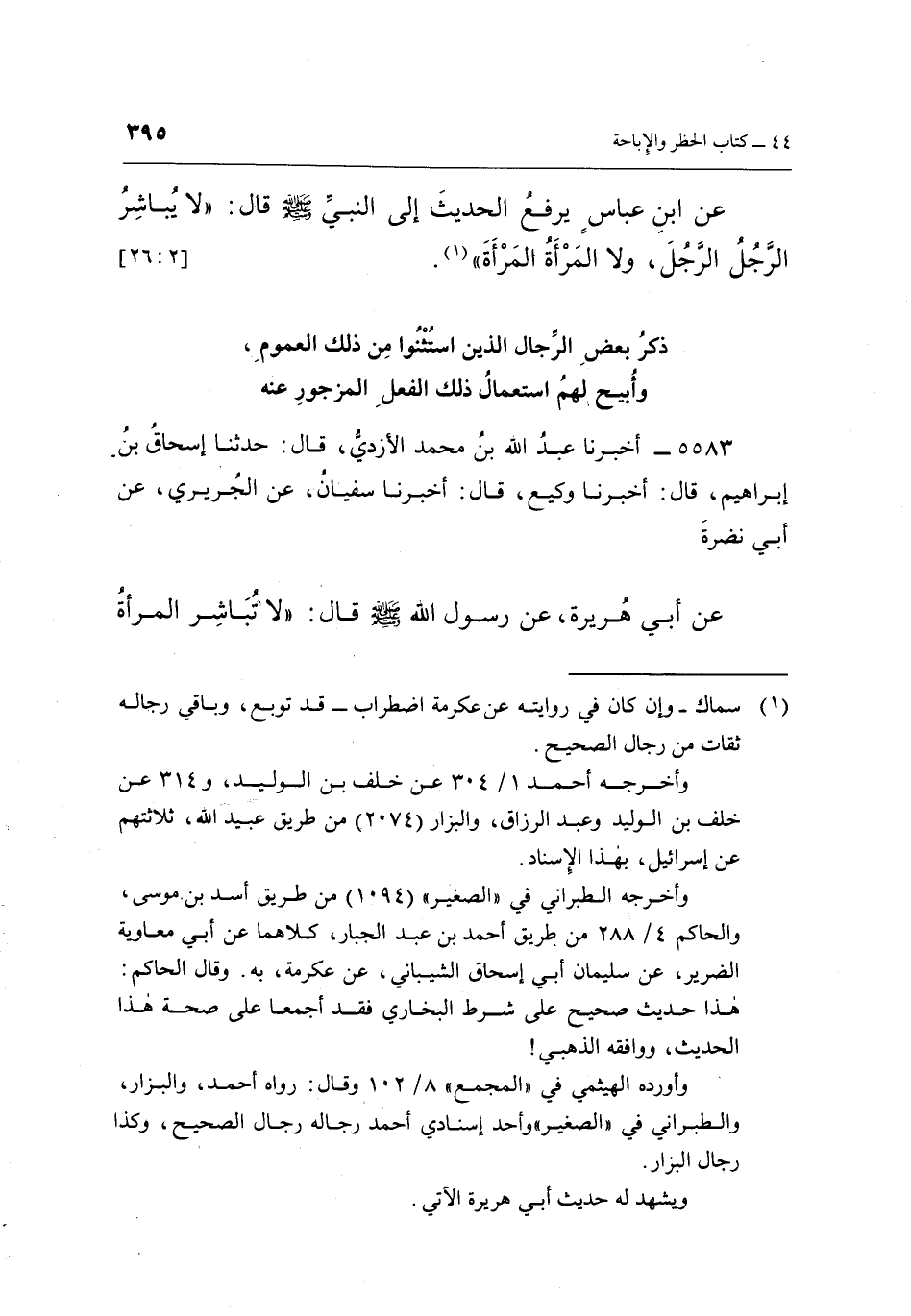 عَنِ ابْنِ عَبَّاسٍ، يَرْفَعُ الْحَدِيثَ إِلَى النَّبِيِّ صَلَّى اللَّهُ عَلَيْهِ وَسَلَّمَ، قَالَ: «لَا يُبَاشِرُ الرَّجُلُ الرَّجُلَ، وَلَا الْمَرْأَةُ الْمَرْأَةَ» (¬1) . [2: 26]