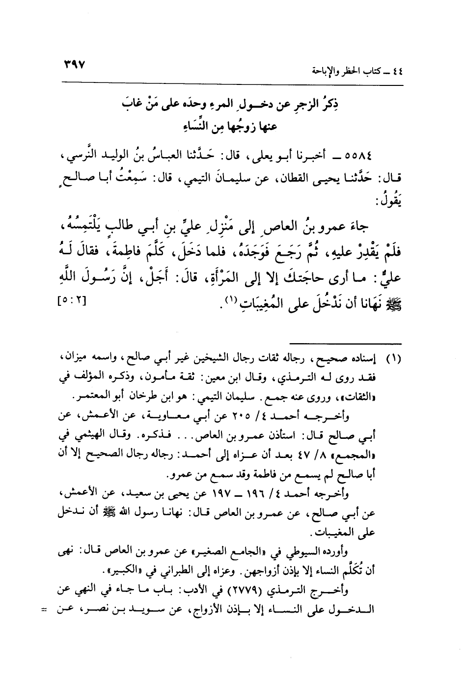 5584 - أَخْبَرَنَا أَبُو يَعْلَى، قَالَ: حَدَّثَنَا الْعَبَّاسُ بْنُ الْوَلِيدِ النَّرْسِيُّ، قَالَ: حَدَّثَنَا يَحْيَى الْقَطَّانُ، عَنْ سُلَيْمَانَ التَّيْمِيِّ، قَالَ: سَمِعْتُ أَبَا صَالِحٍ، يَقُولُ: جَاءَ عَمْرُو بْنُ الْعَاصِ إِلَى مَنْزِلِ عَلِيِّ بْنِ أَبِي طَالِبٍ يَلْتَمِسُهُ، فَلَمْ يَقْدِرْ عَلَيْهِ، ثُمَّ رَجَعَ فَوَجَدَهُ، فَلَمَّا دَخَلَ كَلَّمَ فَاطِمَةَ فَقَالَ لَهُ عَلِيٌّ: مَا أَرَى حَاجَتَكَ إِلَّا إِلَى الْمَرْأَةِ، قَالَ: أَجَلْ، إِنَّ رَسُولَ اللَّهِ صَلَّى اللَّهُ عَلَيْهِ وَسَلَّمَ نَهَانَا أَنْ نَدْخُلَ عَلَى الْمُغِيبَاتِ (¬1) . [2: 5]