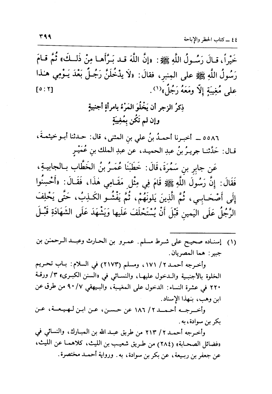 خَيْرًا، قَالَ رَسُولُ اللَّهِ صَلَّى اللَّهُ عَلَيْهِ وَسَلَّمَ: «إِنَّ اللَّهَ قَدْ بَرَّأَهَا مِنْ ذَلِكَ» ثُمَّ قَامَ رَسُولُ اللَّهِ صَلَّى اللَّهُ عَلَيْهِ وَسَلَّمَ عَلَى الْمِنْبَرِ، فَقَالَ: «لَا يَدْخُلَنَّ رَجُلٌ بَعْدَ يَوْمِي هَذَا عَلَى مُغِيبَةٍ إِلَّا وَمَعَهُ رَجُلٌ» (¬1) . [2: 5]