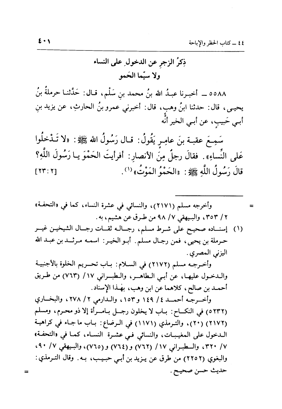 5588 - أَخْبَرَنَا عَبْدُ اللَّهِ بْنُ مُحَمَّدِ بْنِ سَلْمٍ، قَالَ: حَدَّثَنَا حَرْمَلَةُ بْنُ يَحْيَى، قَالَ: حَدَّثَنَا ابْنُ وَهْبٍ، قَالَ: أَخْبَرَنِي عَمْرُو بْنُ الْحَارِثِ، عَنْ يَزِيدَ بْنِ أَبِي حَبِيبٍ، عَنْ أَبِي الْخَيْرِ أَنَّهُ سَمِعَ عُقْبَةَ بْنَ عَامِرٍ، يَقُولُ: قَالَ رَسُولُ اللَّهِ صَلَّى اللَّهُ عَلَيْهِ وَسَلَّمَ: «لَا تَدْخُلُوا عَلَى النِّسَاءِ» فَقَالَ رَجُلٌ مِنَ الْأَنْصَارِ: أَفَرَأَيْتَ الْحَمْوَ يَا رَسُولَ اللَّهِ؟ قَالَ رَسُولُ اللَّهِ صَلَّى اللَّهُ عَلَيْهِ وَسَلَّمَ: «الْحَمْوُ الْمَوْتُ» (¬1) . [2: 32]