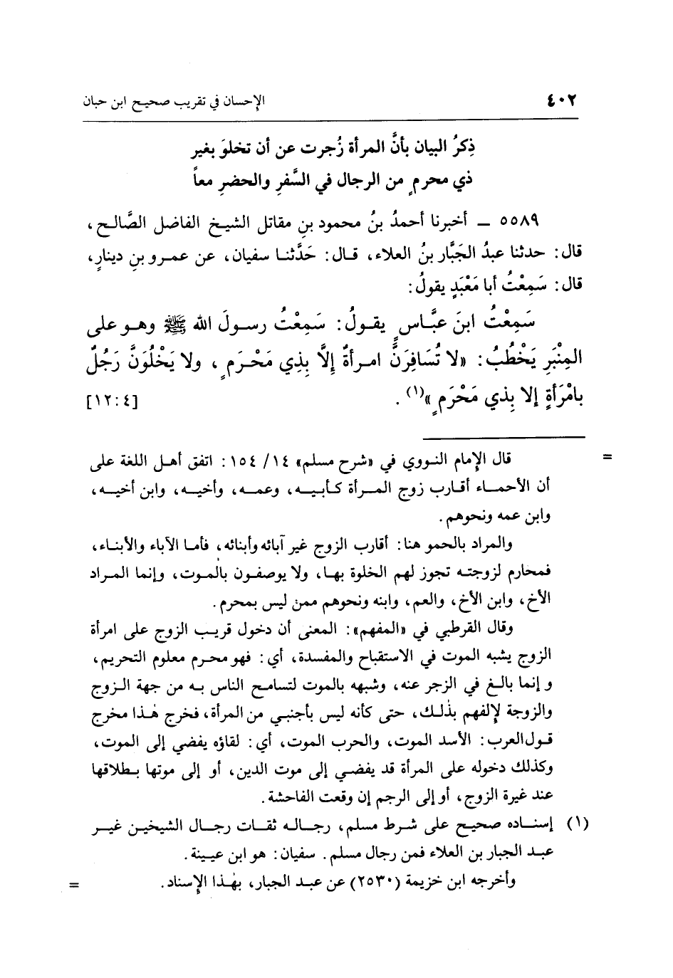 5589 - أَخْبَرَنَا أَحْمَدُ بْنُ مَحْمُودِ بْنِ مُقَاتِلٍ الشَّيْخُ الْفَاضِلُ الصَّالِحُ، قَالَ: حَدَّثَنَا عَبْدُ الْجَبَّارِ بْنُ الْعَلَاءِ، قَالَ: حَدَّثَنَا سُفْيَانُ، عَنْ عَمْرِو بْنِ دِينَارٍ، قَالَ: سَمِعْتُ أَبَا مَعْبَدٍ، يَقُولُ: سَمِعْتُ ابْنَ عَبَّاسٍ، يَقُولُ: سَمِعْتُ رَسُولَ اللَّهِ صَلَّى اللَّهُ عَلَيْهِ وَسَلَّمَ وَهُوَ عَلَى الْمِنْبَرِ يَخْطُبُ: «لَا تُسَافِرَنَّ امْرَأَةٌ إِلَّا بِذِي مَحْرَمٍ، وَلَا يَخْلُوَنَّ رَجُلٌ بِامْرَأَةٍ إِلَّا بِذِي مَحْرَمٍ» (¬1) . [4: 12]