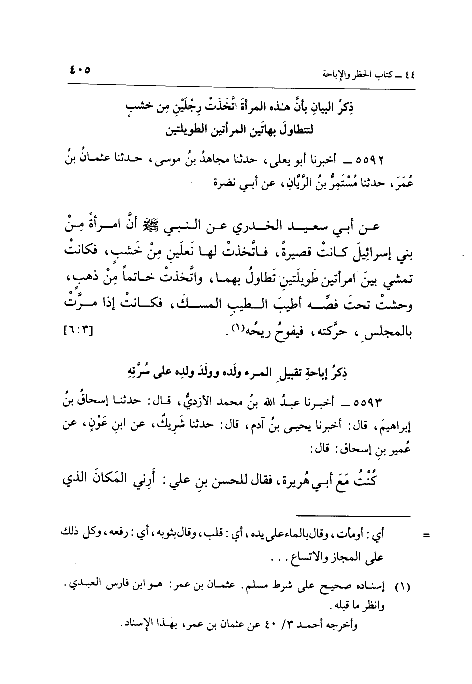 5592 - أَخْبَرَنَا أَبُو يَعْلَى، حَدَّثَنَا مُجَاهِدُ بْنُ مُوسَى، حَدَّثَنَا عُثْمَانُ بْنُ عُمَرَ، حَدَّثَنَا مُسْتَمِرُّ بْنُ الرَّيَّانِ، عَنْ أَبِي نَضْرَةَ عَنْ أَبِي سَعِيدٍ الْخُدْرِيِّ، عَنِ النَّبِيِّ صَلَّى اللَّهُ عَلَيْهِ وَسَلَّمَ: إِنَّ امْرَأَةً مِنْ بَنِي إِسْرَائِيلَ كَانَتْ قَصِيرَةً، فَاتَّخَذَتْ لَهَا نَعْلَيْنِ مِنْ خَشَبِ فَكَانَتْ تَمْشِي بَيْنَ امْرَأَتَيْنِ طَوِيلَتَيْنِ تَطَاوَلُ بِهِمَا، وَاتَّخَذَتْ خَاتَمًا مِنْ ذَهَبٍ وَحَشَتْ تَحْتَ فَصِّهِ أَطْيَبَ الطِّيبِ الْمِسْكَ، فَكَانَتْ إِذَا مَرَّتْ بِالْمَجْلِسِ حَرَّكَتْهُ فَيَفُوحُ رِيحُهُ (¬1) . [3: 6]