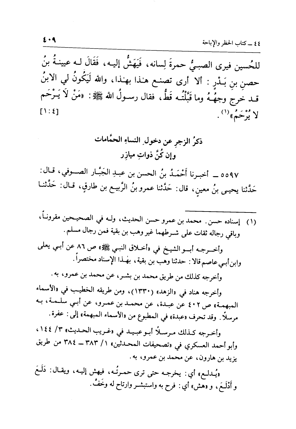 لِلْحُسَيْنِ، فَيَرَى الصَّبِيُّ حُمْرَةَ لِسَانِهِ، فَيَهَشُّ إِلَيْهِ، فَقَالَ لَهُ عُيَيْنَةُ بْنُ حِصْنِ بْنِ بَدْرٍ: أَلَا أَرَى تَصْنَعُ هَذَا بِهَذَا، وَاللَّهِ لَيَكُونُ لِيَ الِابْنُ قَدْ خَرَجَ وَجْهُهُ وَمَا قَبَّلْتُهُ قَطُّ، فَقَالَ رَسُولُ اللَّهِ صَلَّى اللَّهُ عَلَيْهِ وَسَلَّمَ: «مَنْ لَا يَرْحَمُ لَا يُرْحَمُ» (¬1) . [4: 1]