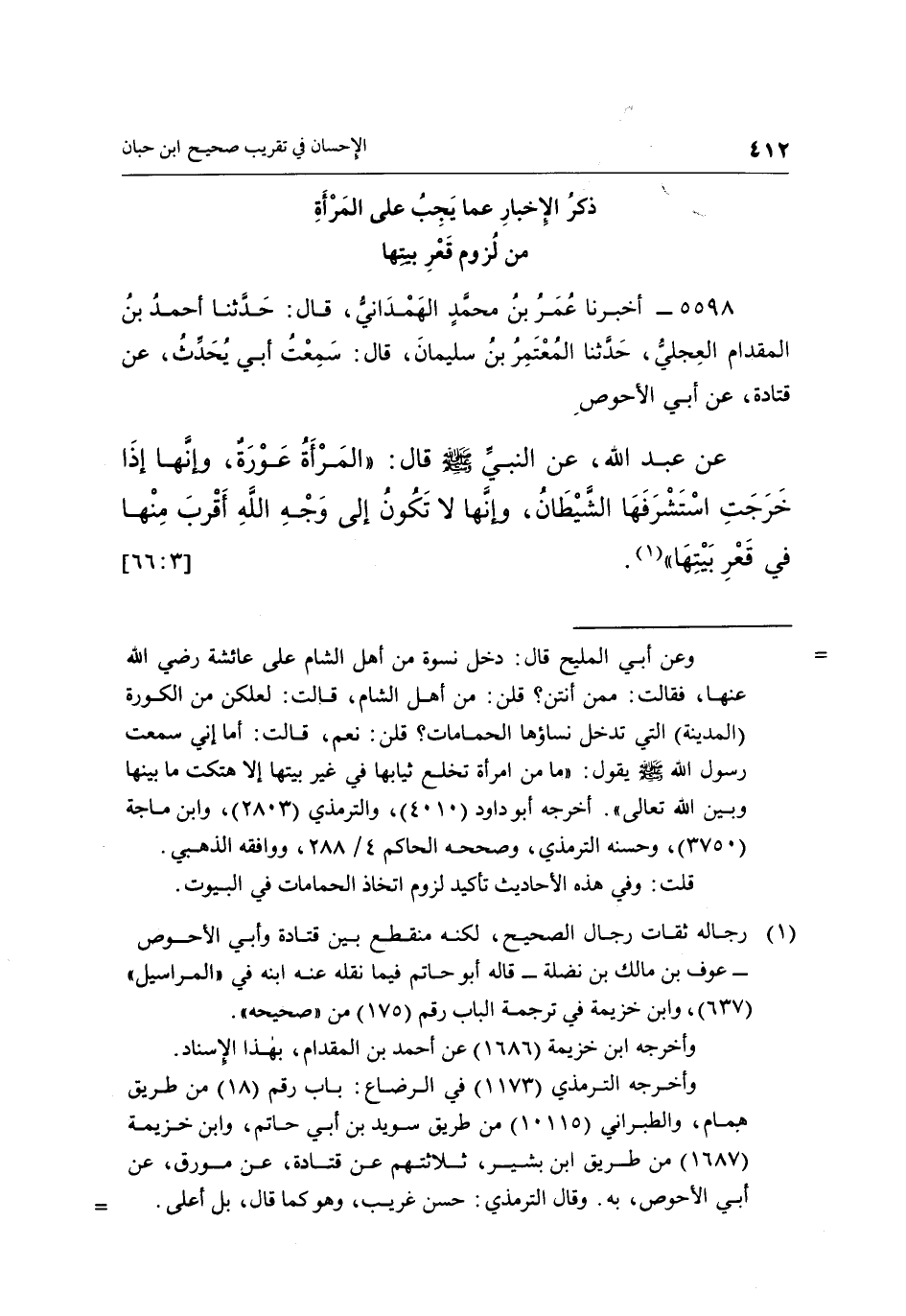 5598 - أَخْبَرَنَا عُمَرُ بْنُ مُحَمَّدٍ الْهَمْدَانِيُّ، قَالَ: حَدَّثَنَا أَحْمَدُ بْنُ الْمِقْدَامِ الْعِجْلِيُّ حَدَّثَنَا الْمُعْتَمِرُ بْنُ سُلَيْمَانَ، قَالَ: سَمِعْتُ أَبِي يُحَدِّثُ، عَنْ قَتَادَةَ، عَنْ أَبِي الْأَحْوَصِ عَنْ عَبْدِ اللَّهِ، عَنِ النَّبِيِّ صَلَّى اللَّهُ عَلَيْهِ وَسَلَّمَ قَالَ: «الْمَرْأَةُ عَوْرَةٌ، وَإِنَّهَا إِذَا خَرَجَتِ اسْتَشْرَفَهَا الشَّيْطَانُ، وَإِنَّهَا لَا تَكُونُ إِلَى وَجْهِ اللَّهِ أَقْرَبَ مِنْهَا فِي قَعْرِ بَيْتِهَا» (¬1) . [3: 66]