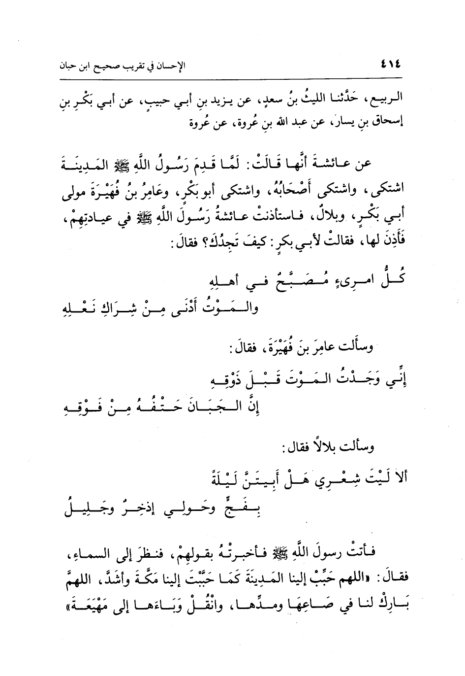 الرَّبِيعِ، حَدَّثَنَا اللَّيْثُ بْنُ سَعْدٍ، عَنْ يَزِيدَ بْنِ أَبِي حَبِيبٍ، عَنْ أَبِي بَكْرِ بْنِ إِسْحَاقَ بْنِ يَسَارٍ، عَنْ عَبْدِ اللَّهِ بْنِ عُرْوَةَ، عَنْ عُرْوَةَ عَنْ عَائِشَةَ، أَنَّهَا قَالَتْ: لَمَّا قَدِمَ رَسُولُ اللَّهِ صَلَّى اللَّهُ عَلَيْهِ وَسَلَّمَ الْمَدِينَةَ اشْتَكَى، وَاشْتَكَى أَصْحَابُهُ، وَاشْتَكَى أَبُو بَكْرٍ وَعَامِرُ بْنُ فُهَيْرَةَ مَوْلَى أَبِي بَكْرٍ وَبِلَالٌ، فَاسْتَأْذَنَتْ عَائِشَةُ رَسُولَ اللَّهِ صَلَّى اللَّهُ عَلَيْهِ وَسَلَّمَ فِي عِيَادَتِهِمْ، فَأَذِنَ لَهَا، فَقَالَتْ لِأَبِي بَكْرٍ: كَيْفَ تَجِدُكَ؟ فَقَالَ: