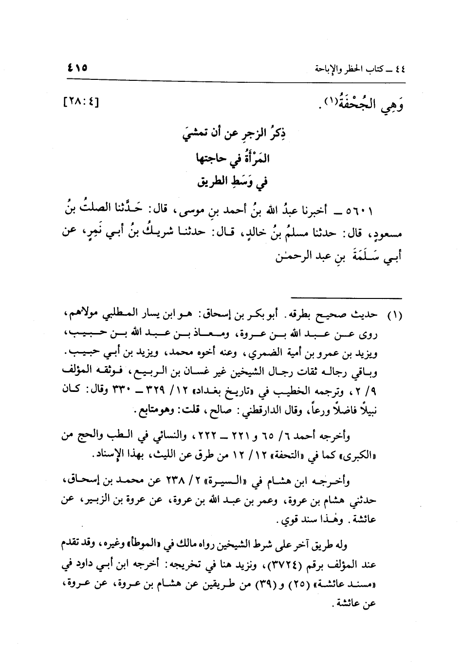 (¬1) حديث صحيح بطرقه. أبو بكر بن إسحاق: هو ابن يسار المطلبي مولاهم، روى عن عبد الله بن عروة ومعاذ بن عبد الله بن حبيب، ويزيد بن عمرو بن أمية الضمري، وعنه أخوه محمد، ويزيد بن أبي حبيب. وباقي رجاله ثقات رجال الشيخين غير غسان بن الربيع، فوثقه المؤلف 9/2، وترجمه الخطيب في " تاريخ بغداد " 12/329-330 وقال: كان نبيلاً فاضلاً ورعاً، وقال الدارقطني: صالح، قلت: وهو متابع.