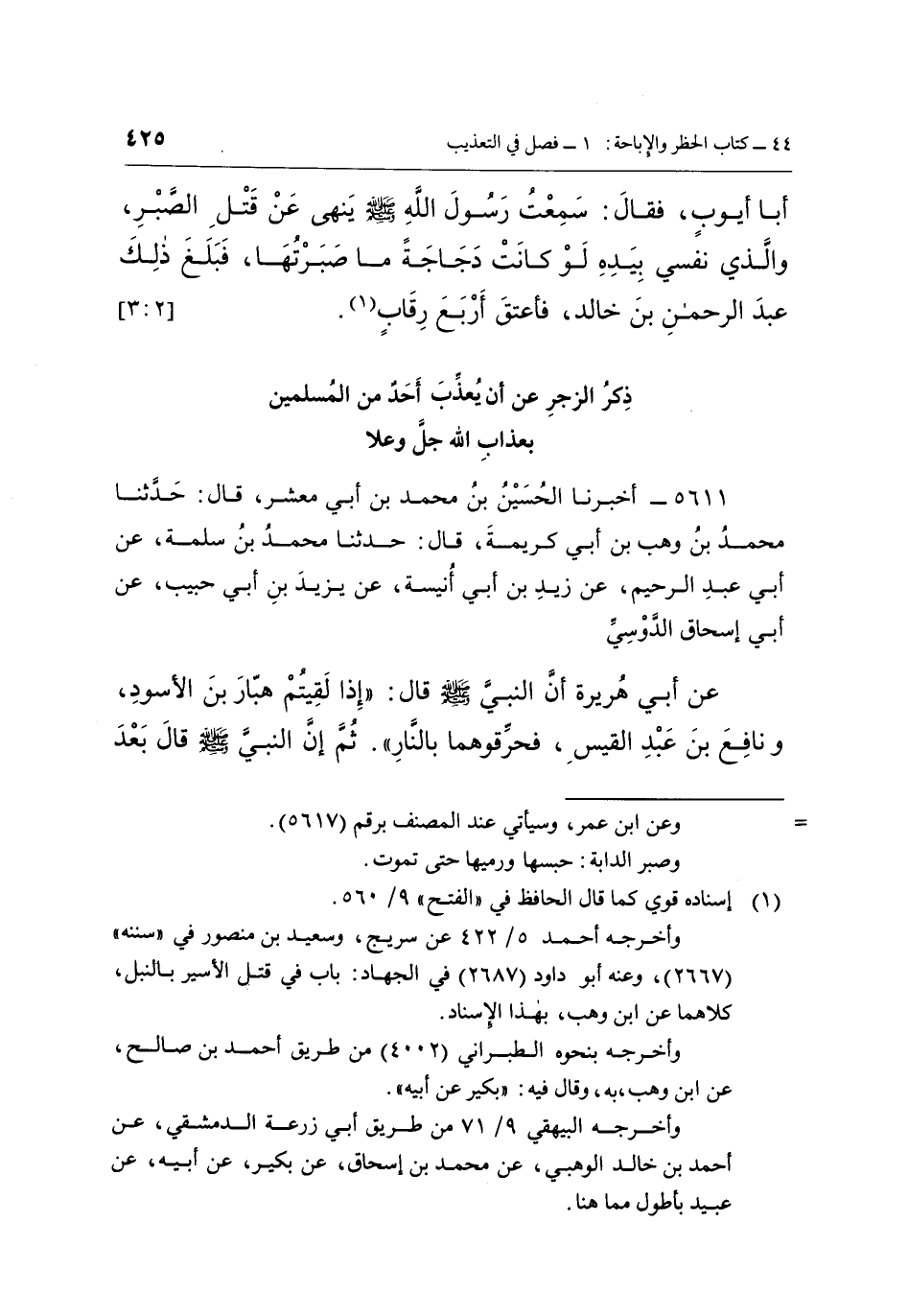 5611 - أَخْبَرَنَا الْحُسَيْنُ بْنُ مُحَمَّدِ بْنِ أَبِي مَعْشَرٍ، قَالَ: حَدَّثَنَا مُحَمَّدُ بْنُ وَهْبِ بْنِ أَبِي كَرِيمَةَ، قَالَ: حَدَّثَنَا مُحَمَّدُ بْنُ سَلَمَةَ، عَنْ أَبِي عَبْدِ الرَّحِيمِ، عَنْ زَيْدِ بْنِ أَبِي أُنَيْسَةَ، عَنْ يَزِيدَ بْنِ أَبِي حَبِيبٍ، عَنْ أَبِي إِسْحَاقَ الدَّوْسِيِّ عَنْ أَبِي هُرَيْرَةَ، أَنَّ النَّبِيَّ صَلَّى اللَّهُ عَلَيْهِ وَسَلَّمَ قَالَ: «إِذَا لَقِيتُمْ هَبَّارَ بْنَ الْأَسْوَدِ وَنَافِعَ بْنَ عَبْدِ الْقَيْسِ فَحَرِّقُوهُمَا بِالنَّارِ» ثُمَّ إِنَّ النَّبِيَّ صَلَّى اللَّهُ عَلَيْهِ وَسَلَّمَ قَالَ بَعْدَ
