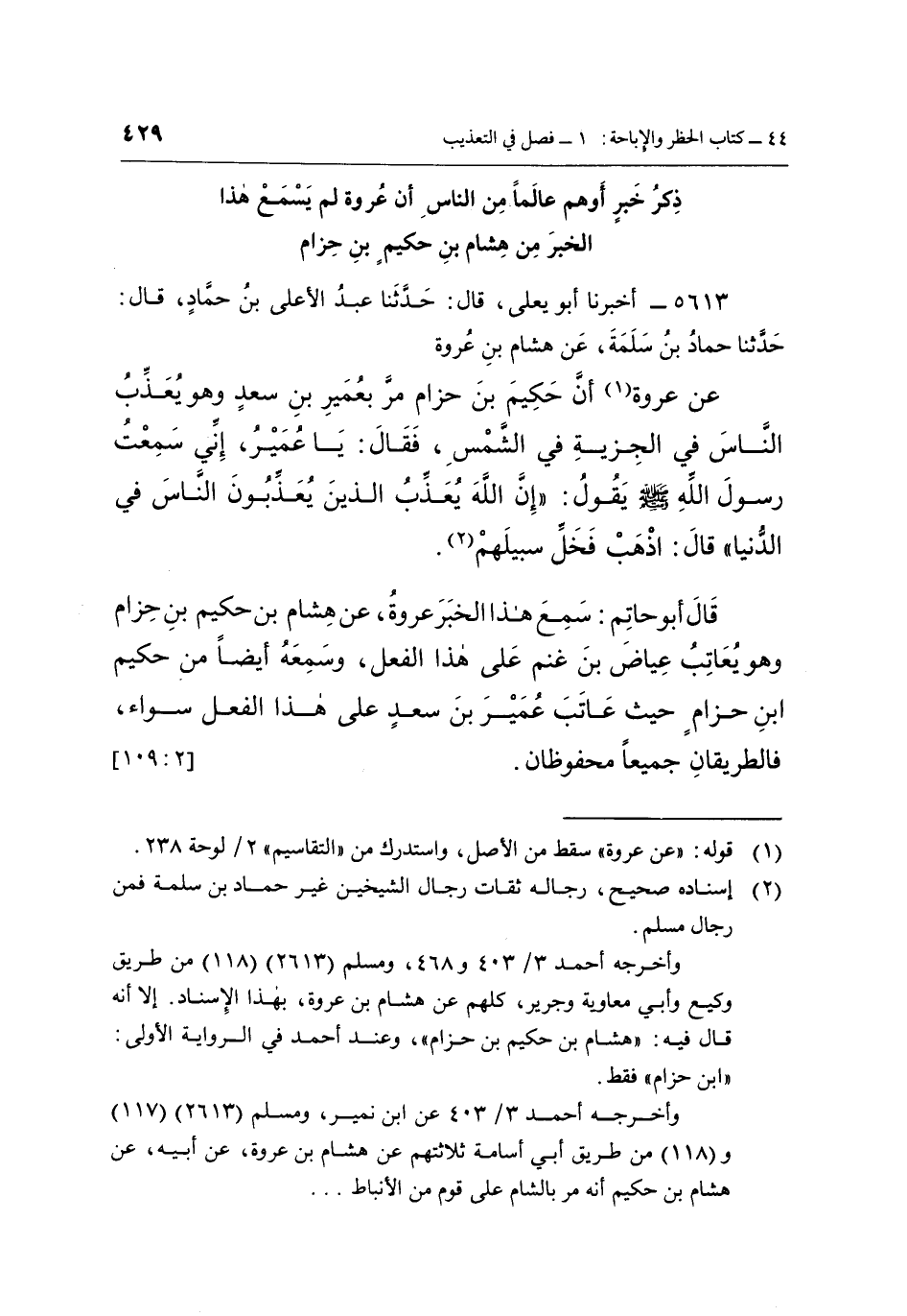 5613 - أَخْبَرَنَا أَبُو يَعْلَى، قَالَ: حَدَّثَنَا عَبْدُ الْأَعْلَى بْنُ حَمَّادٍ، قَالَ: حَدَّثَنَا حَمَّادُ بْنُ سَلَمَةَ، عَنْ هِشَامِ بْنِ عُرْوَةَ عَنْ عُرْوَةَ (¬1) أَنَّ حَكِيمَ بْنَ حِزَامٍ، مَرَّ بِعُمَيْرِ بْنِ سَعْدٍ وَهُوَ يُعَذِّبُ النَّاسَ فِي الْجِزْيَةِ فِي الشَّمْسِ، فَقَالَ: يَا عُمَيْرُ، إِنِّي سَمِعْتُ رَسُولَ اللَّهِ صَلَّى اللَّهُ عَلَيْهِ وَسَلَّمَ يَقُولُ: "إِنَّ اللَّهَ يُعَذِّبُ الَّذِينَ يُعَذِّبُونَ النَّاسَ فِي الدُّنْيَا"، قَالَ: اذْهَبْ فَخَلِّ سَبِيلَهُمْ. (¬2)