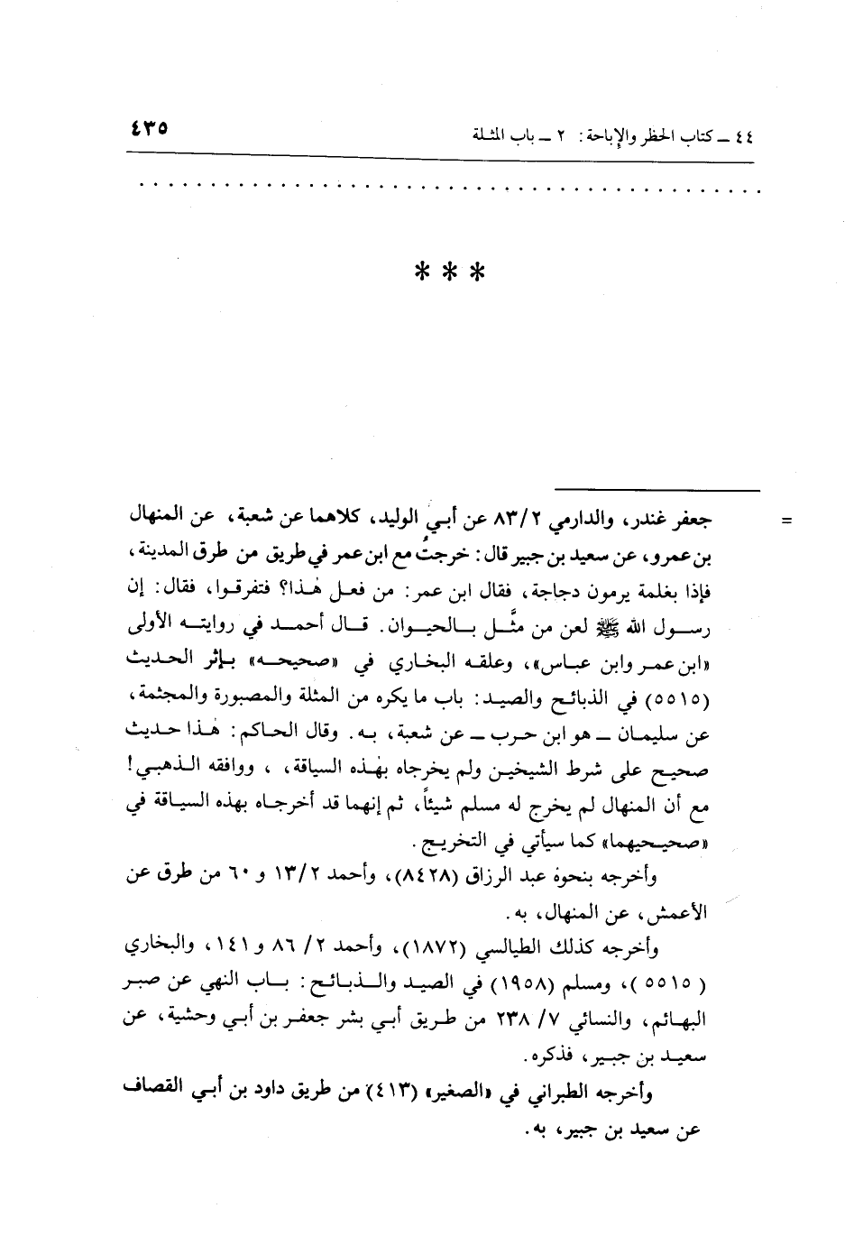 = جعفر غندر، والدارمي 2/83 عن أبي الوليد، كلاهما عن شعبة، عن المنهال بن عمرو، عن سعيد بن جبير قال: خرجت مع ابن عمر في طريق من طرق المدينة، فإذا بغلمة يرمون دجاجة، فقال ابن عمر: من فعل هذا؟ تفرقوا، فقال: إن رسول الله صَلَّى اللهُ عَلَيْهِ وَسَلَّمَ لعن من مثل بالحيوان. قال أحمد في روايته الأولى " ابن عمر وابن عباس "، وعلقه البخاري في " صحيحه " بإثر الحديث (5515) في الذبائح والصيد: باب ما يكره من المثلة والمصبورة والمجثمة، عن سليمان -هو ابن حرب- عن شعبة، به. وقال الحاكم: هذا حديث صحيح على شرط الشيخين ولم يخرجاه بهذه السياقة، ووافقه الذهبي! مع أن المنهال لم يخرج له مسلم شيئاً، ثم إنهما قد أخرجاه بهذه السياقة في " صحيحيهما " كما سيأتي في التخريج.