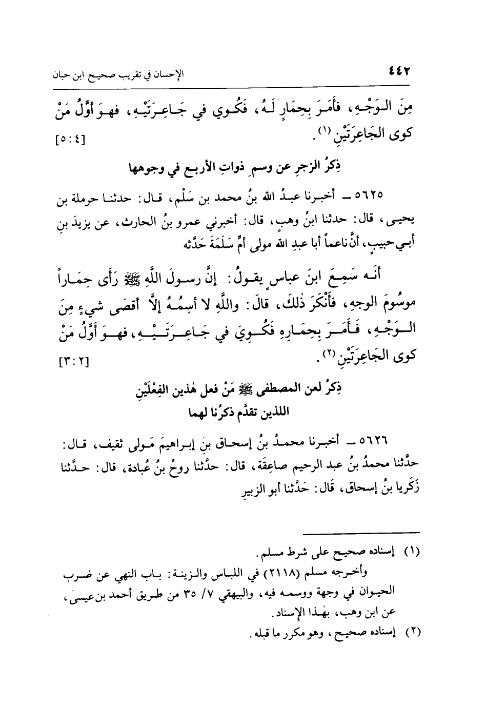 5625 - أَخْبَرَنَا عَبْدُ اللَّهِ بْنُ مُحَمَّدِ بْنِ سَلْمٍ، قَالَ: حَدَّثَنَا حَرْمَلَةُ بْنُ يَحْيَى، قَالَ: حَدَّثَنَا ابْنُ وَهْبٍ، قَالَ: أَخْبَرَنِي عَمْرُو بْنُ الْحَارِثِ، عَنْ يَزِيدَ بْنِ أَبِي حَبِيبٍ، أَنَّ نَاعِمًا أَبَا عَبْدِ اللَّهِ، مَوْلَى أُمِّ سَلَمَةَ حَدَّثَهُ أَنَّهُ سَمِعَ ابْنَ عَبَّاسٍ، يَقُولُ: إِنَّ رَسُولَ اللَّهِ صَلَّى اللَّهُ عَلَيْهِ وَسَلَّمَ رَأَى حِمَارًا مَوْسُومَ الْوَجْهِ فَأَنْكَرَ ذَلِكَ، قَالَ: وَاللَّهِ لَا أَسِمُهُ إِلَّا أَقْصَى شَيْءٍ مِنَ الْوَجْهِ، فَأَمَرَ بِحِمَارِهِ فَكُوِيَ فِي جَاعِرَتَيْهِ، فَهُوَ أَوَّلُ مَنْ كَوَى الْجَاعِرَتَيْنِ (¬2) . [2: 3]