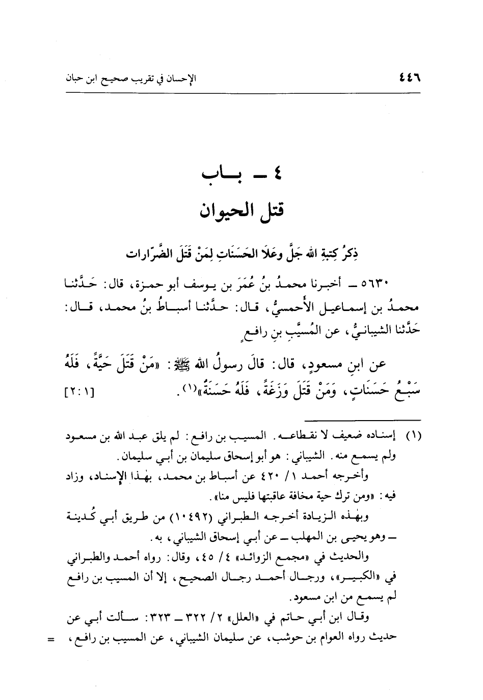 5630 - أَخْبَرَنَا مُحَمَّدُ بْنُ عُمَرَ بْنِ يُوسُفَ أَبُو حَمْزَةَ، قَالَ: حَدَّثَنَا مُحَمَّدُ بْنُ إِسْمَاعِيلَ الْأَحْمَسِيُّ، قَالَ: حَدَّثَنَا أَسْبَاطُ بْنُ مُحَمَّدٍ، قَالَ: حَدَّثَنَا الشَّيْبَانِيُّ، عَنِ الْمُسَيِّبِ بْنِ رَافِعٍ عَنِ ابْنِ مَسْعُودٍ، قَالَ: قَالَ رَسُولُ اللَّهِ صَلَّى اللَّهُ عَلَيْهِ وَسَلَّمَ: «مَنْ قَتَلَ حَيَّةً فَلَهُ سَبْعُ حَسَنَاتٍ، وَمَنْ قَتَلَ وَزَغَةً فَلَهُ حَسَنَةٌ» (¬1) . [1: 2]