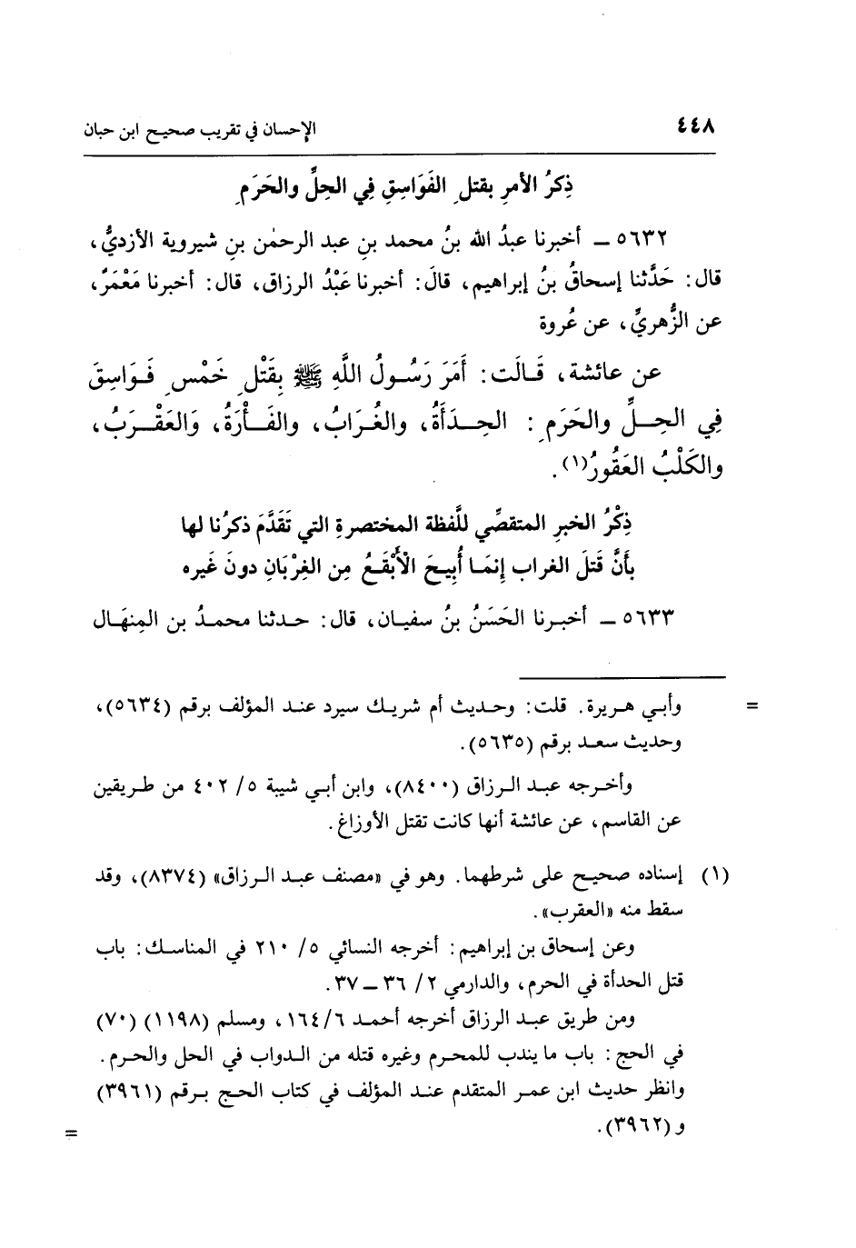 5632 - أَخْبَرَنَا عَبْدُ اللَّهِ بْنُ مُحَمَّدِ بْنِ عَبْدِ الرَّحْمَنِ بْنِ شِيرَوَيْهِ الْأَزْدِيُّ، قَالَ: حَدَّثَنَا إِسْحَاقُ بْنُ إِبْرَاهِيمَ، قَالَ: أَخْبَرَنَا عَبْدُ الرَّزَّاقِ، قَالَ: أَخْبَرَنَا مَعْمَرٌ، عَنِ الزُّهْرِيِّ، عَنْ عُرْوَةَ عَنْ عَائِشَةَ، قَالَتْ: أَمَرَ رَسُولُ اللَّهِ صَلَّى اللَّهُ عَلَيْهِ وَسَلَّمَ بِقَتْلِ خَمْسِ فَوَاسِقَ فِي الْحِلِّ وَالْحَرَمِ: الْحِدَأَةُ، وَالْغُرَابُ، وَالْفَأْرَةُ، وَالْعَقْرَبُ، وَالْكَلْبُ الْعَقُورُ (¬1) .