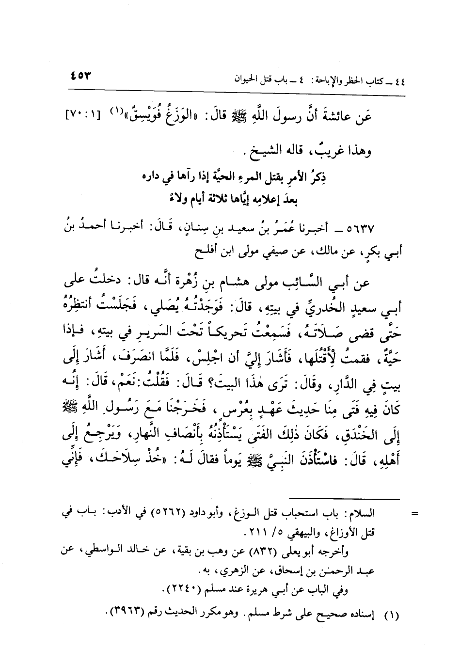 5637 - أَخْبَرَنَا عُمَرُ بْنُ سَعِيدِ بْنِ سِنَانٍ، قَالَ: أَخْبَرَنَا أَحْمَدُ بْنُ أَبِي بَكْرٍ، عَنْ مَالِكٍ، عَنْ صَيْفِيٍّ، مَوْلَى ابْنِ أَفْلَحَ عَنْ أَبِي السَّائِبِ، مَوْلَى هِشَامِ بْنِ زُهْرَةَ أَنَّهُ قَالَ: دَخَلْتُ عَلَى أَبِي سَعِيدٍ الْخُدْرِيِّ فِي بَيْتِهِ، قَالَ: فَوَجَدْتُهُ يُصَلِّي، فَجَلَسْتُ أَنْتَظِرُهُ حَتَّى قَضَى صَلَاتَهُ، فَسَمِعْتُ تَحْرِيكًا تَحْتَ السَّرِيرِ فِي بَيْتِهِ، فَإِذَا حَيَّةٌ، فَقُمْتُ لِأَقْتُلَهَا فَأَشَارَ إِلَيَّ أَنِ اجْلِسْ، فَلَمَّا انْصَرَفَ، أَشَارَ إِلَى بَيْتٍ فِي الدَّارِ، وَقَالَ: تَرَى هَذَا الْبَيْتَ؟ قَالَ: فَقُلْتُ: نَعَمْ، قَالَ: إِنَّهُ كَانَ فِيهِ فَتًى مِنَّا حَدِيثَ عَهْدٍ بِعُرْسٍ، فَخَرَجْنَا مَعَ رَسُولِ اللَّهِ صَلَّى اللَّهُ عَلَيْهِ وَسَلَّمَ إِلَى الْخَنْدَقِ، فَكَانَ ذَلِكَ الْفَتَى يَسْتَأْذِنُهُ بِأَنْصَافِ النَّهَارِ، وَيَرْجِعُ إِلَى أَهْلِهِ، قَالَ: فَاسْتَأْذَنَ النَّبِيَّ صَلَّى اللَّهُ عَلَيْهِ وَسَلَّمَ يَوْمًا فَقَالَ لَهُ: «خُذْ سِلَاحَكَ فَإِنِّي