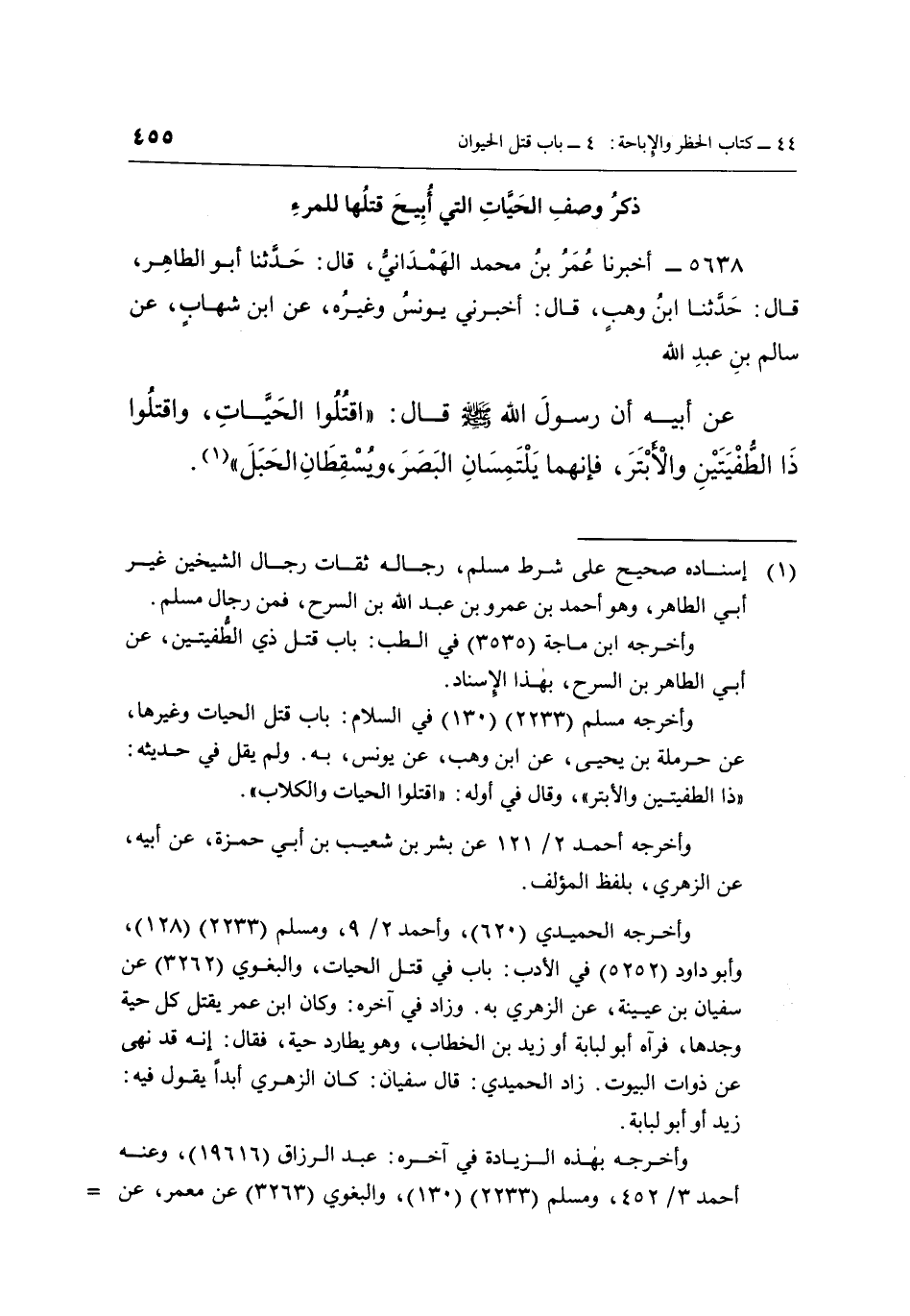 5638 - أَخْبَرَنَا عُمَرُ بْنُ مُحَمَّدٍ الْهَمْدَانِيُّ، قَالَ: حَدَّثَنَا أَبُو الطَّاهِرِ قَالَ: حَدَّثَنَا ابْنُ وَهْبٍ، قَالَ: أَخْبَرَنِي يُونُسُ وَغَيْرُهُ، عَنِ ابْنِ شِهَابٍ، عَنْ سَالِمِ بْنِ عَبْدِ اللَّهِ عَنْ أَبِيهِ، أَنَّ رَسُولَ اللَّهِ صَلَّى اللَّهُ عَلَيْهِ وَسَلَّمَ قَالَ: «اقْتُلُوا الْحَيَّاتِ، وَاقْتُلُوا ذَا الطُّفْيَتَيْنِ وَالْأَبْتَرَ، فَإِنَّهُمَا يَلْتَمِسَانِ الْبَصَرَ وَيُسْقِطَانِ الْحَبَلَ» (¬1) .