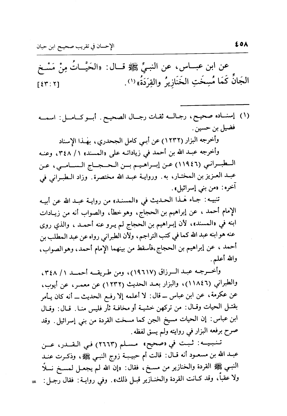 عَنِ ابْنِ عَبَّاسٍ، عَنِ النَّبِيِّ صَلَّى اللَّهُ عَلَيْهِ وَسَلَّمَ قَالَ: «الْحَيَّاتُ مِنْ مَسْخِ الْجَانِّ كَمَا مُسِخَتِ الْخَنَازِيرُ وَالْقِرَدَةُ» (¬1) . [2: 43]