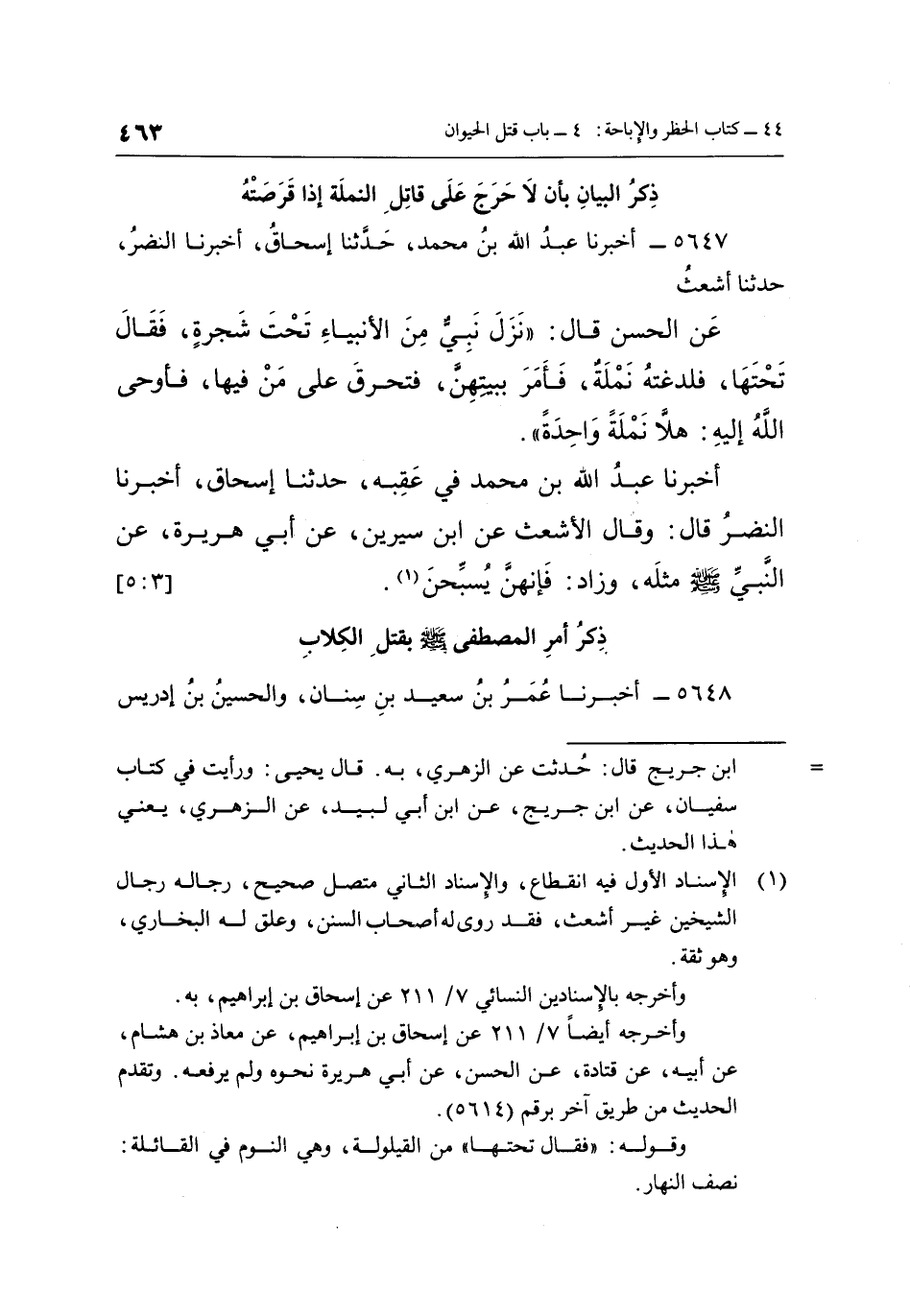 5647 - أَخْبَرَنَا عَبْدُ اللَّهِ بْنُ مُحَمَّدٍ، حَدَّثَنَا إِسْحَاقُ، أَخْبَرَنَا النَّضْرُ، حَدَّثَنَا أَشْعَثُ عَنِ الْحَسَنِ، قَالَ: «نَزَلَ نَبِيٌّ مِنَ الْأَنْبِيَاءِ تَحْتَ شَجَرَةٍ، فَقَالَ تَحْتَهَا، فَلَدَغَتْهُ نَمْلَةٌ فَأَمَرَ بِبَيْتِهِنَّ، فَتُحْرَقَ عَلَى مَنْ فِيهَا، فَأَوْحَى اللَّهُ إِلَيْهِ: هَلَّا نَمْلَةً وَاحِدَةً» .