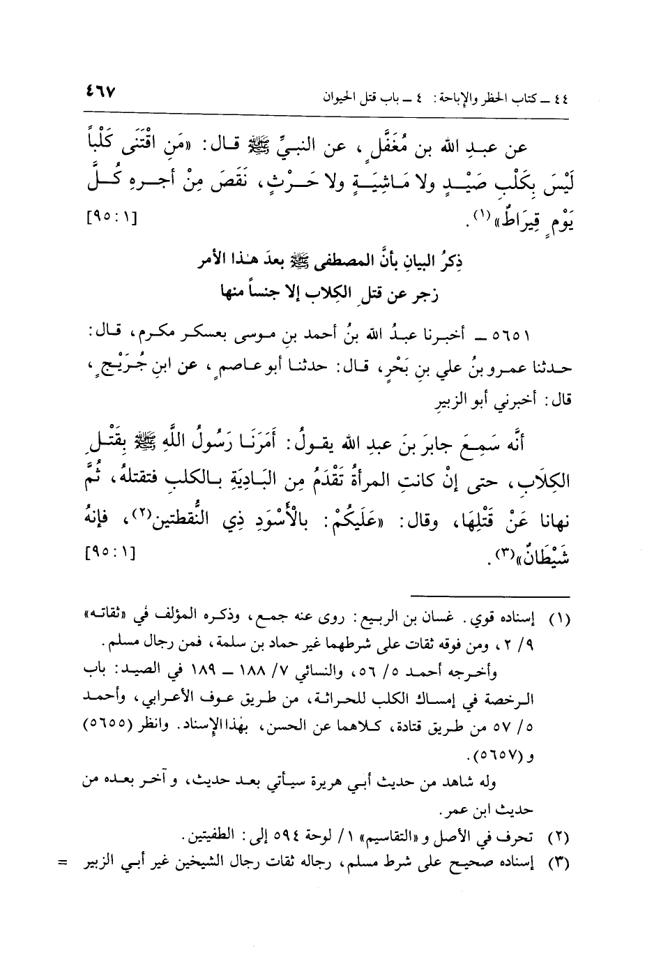 5651 - أَخْبَرَنَا عَبْدُ اللَّهِ بْنُ أَحْمَدَ بْنِ مُوسَى، بِعَسْكَرِ مُكْرَمٍ، قَالَ: حَدَّثَنَا عَمْرُو بْنُ عَلِيِّ بْنِ بَحْرٍ، قَالَ: حَدَّثَنَا أَبُو عَاصِمٍ، عَنِ ابْنِ جُرَيْجٍ، قَالَ: أَخْبَرَنِي أَبُو الزُّبَيْرِ أَنَّهُ سَمِعَ جَابِرَ بْنَ عَبْدِ اللَّهِ، يَقُولُ: أَمَرَنَا رَسُولُ اللَّهِ صَلَّى اللَّهُ عَلَيْهِ وَسَلَّمَ بِقَتْلِ الْكِلَابِ حَتَّى إِنْ كَانَتِ الْمَرْأَةُ تَقْدُمُ مِنَ الْبَادِيَةِ بِالْكَلْبِ فَتَقْتُلُهُ، ثُمَّ نَهَانَا عَنْ قَتْلِهَا، وَقَالَ: «عَلَيْكُمْ بِالْأَسْوَدِ ذِي النُّقْطَتَيْنِ (¬2) ، فَإِنَّهُ شَيْطَانٌ» (¬3) . [1: 95]