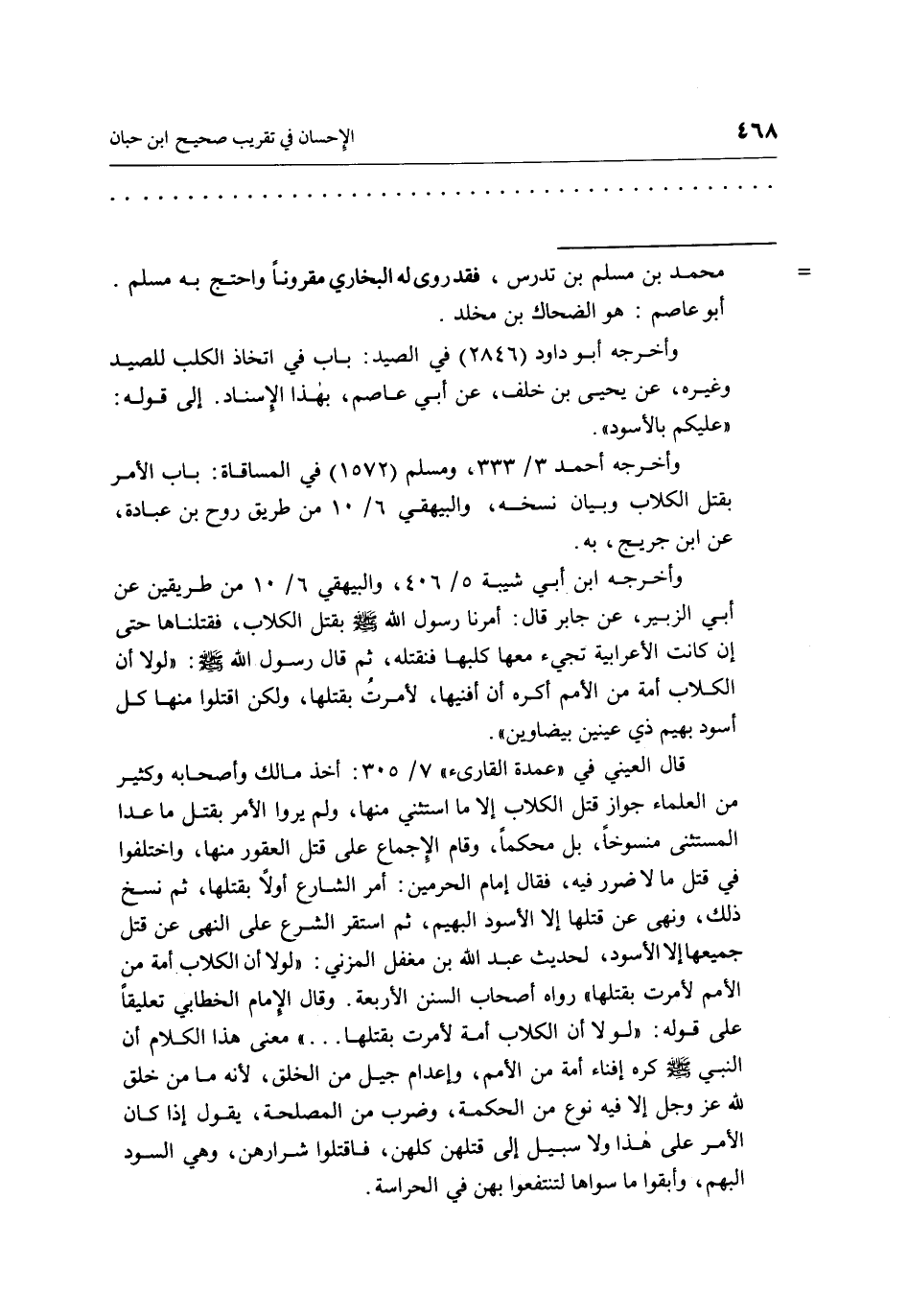وأخرجه ابن أبي شيبة 5/406، والبيهقي 6/10 من طريقين عن أبي الزبير، عن جابر قال: أمرنا رسول الله صَلَّى اللهُ عَلَيْهِ وَسَلَّمَ بقتل الكلاب، فقتلناها حتى إن كانت الأعرابية تجيء معها كلبها فنقتله، ثم قال رسول الله صَلَّى اللهُ عَلَيْهِ وَسَلَّمَ: " لولا أن الكلاب أمة من الأمم أكره أن أفنيها، لأمرت بقتلها، ولكن اقتلها منها كل أسود بهيم ذي عينين بيضاوين ".