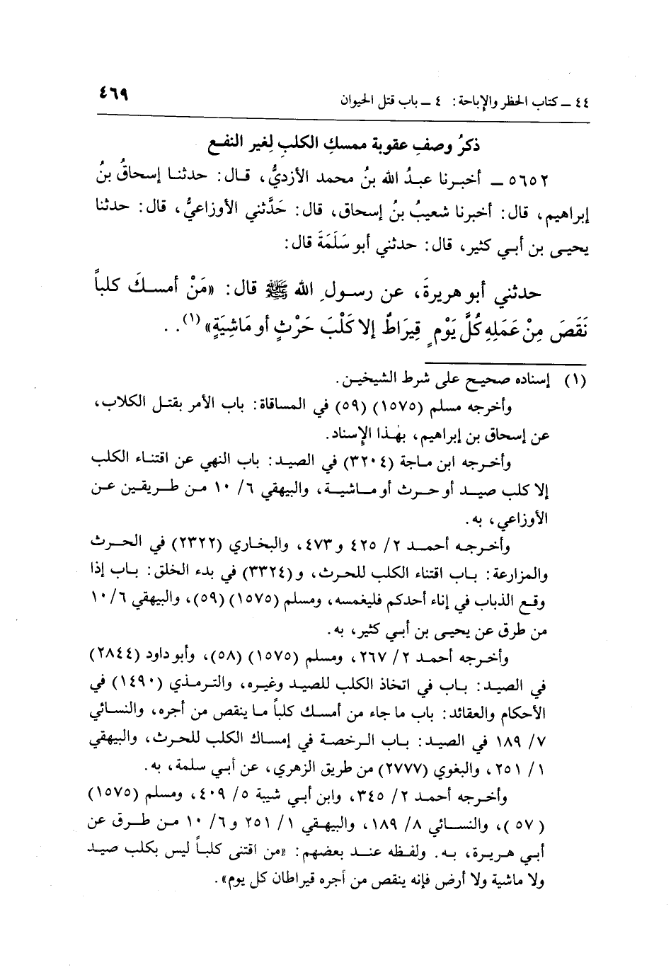 5652 - أَخْبَرَنَا عَبْدُ اللَّهِ بْنُ مُحَمَّدٍ الْأَزْدِيُّ، قَالَ: حَدَّثَنَا إِسْحَاقُ بْنُ إِبْرَاهِيمَ، قَالَ: أَخْبَرَنَا شُعَيْبُ بْنُ إِسْحَاقَ، قَالَ: حَدَّثَنِي الْأَوْزَاعِيُّ، قَالَ: حَدَّثَنَا يَحْيَى بْنُ أَبِي كَثِيرٍ، قَالَ: حَدَّثَنِي أَبُو سَلَمَةَ، قَالَ: حَدَّثَنِي أَبُو هُرَيْرَةَ، عَنْ رَسُولِ اللَّهِ صَلَّى اللَّهُ عَلَيْهِ وَسَلَّمَ قَالَ: «مَنْ أَمْسَكَ كَلْبًا نَقَصَ مِنْ عَمَلِهِ كُلَّ يَوْمٍ قِيرَاطٌ إِلَّا كَلْبَ حَرْثٍ أَوْ مَاشِيَةٍ» (¬1) .