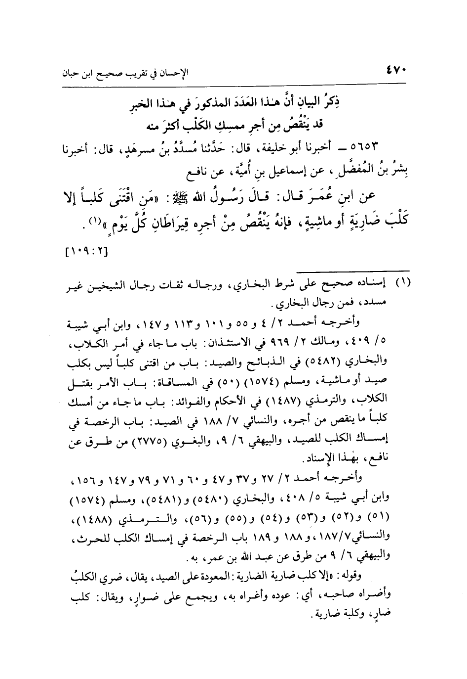 5653 - أَخْبَرَنَا أَبُو خَلِيفَةَ، قَالَ: حَدَّثَنَا مُسَدَّدُ بْنُ مُسَرْهَدٍ، قَالَ: أَخْبَرَنَا بِشْرُ بْنُ الْمُفَضَّلِ، عَنْ إِسْمَاعِيلَ بْنِ أُمَيَّةَ، عَنْ نَافِعٍ عَنِ ابْنِ عُمَرَ، قَالَ: قَالَ رَسُولُ اللَّهِ صَلَّى اللَّهُ عَلَيْهِ وَسَلَّمَ: «مَنِ اقْتَنَى كَلْبًا إِلَّا كَلْبَ ضَارِيَةٍ أَوْ مَاشِيَةٍ فَإِنَّهُ يَنْقُصُ مِنْ أَجْرِهِ قِيرَاطَانِ كُلَّ يَوْمٍ» (¬1) . [2: 109]