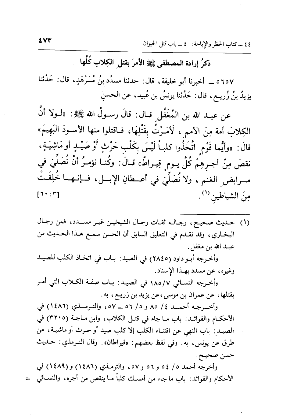 5657 - أَخْبَرَنَا أَبُو خَلِيفَةَ، قَالَ: حَدَّثَنَا مُسَدَّدُ بْنُ مُسَرْهَدٍ، قَالَ: حَدَّثَنَا يَزِيدُ بْنُ زُرَيْعٍ، قَالَ: حَدَّثَنَا يُونُسُ بْنُ عُبَيْدٍ، عَنِ الْحَسَنِ عَنْ عَبْدِ اللَّهِ بْنِ الْمُغَفَّلِ، قَالَ: قَالَ رَسُولُ اللَّهِ صَلَّى اللَّهُ عَلَيْهِ وَسَلَّمَ: «لَوْلَا أَنَّ الْكِلَابَ أُمَّةٌ مِنَ الْأُمَمِ لَأَمَرْتُ بِقَتْلِهَا، فَاقْتُلُوا مِنْهَا الْأَسْوَدَ الْبَهِيمَ» قَالَ: «وَأَيُّمَا قَوْمٍ اتَّخَذُوا كَلْبًا لَيْسَ بِكَلْبِ حَرْثٍ أَوْ صَيْدٍ أَوْ مَاشِيَةٍ نَقَصَ مِنْ أَجْرِهِمْ كُلَّ يَوْمٍ قِيرَاطٌ» قَالَ: وَكُنَّا نُؤْمَرُ أَنْ نُصَلِّيَ فِي مَرَابِضِ الْغَنَمِ، وَلَا نُصَلِّيَ فِي أَعْطَانِ الْإِبِلِ، فَإِنَّهَا خُلِقَتْ مِنَ الشَّيَاطِينِ (¬1) . [3: 60]