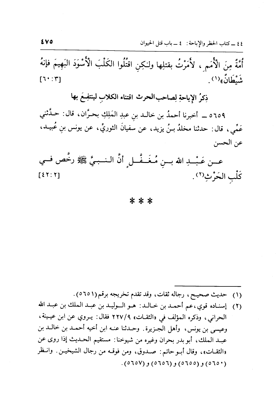 5659 - أَخْبَرَنَا أَحْمَدُ بْنُ خَالِدِ بْنِ عَبْدِ الْمَلِكِ، بِحَرَّانَ، قَالَ: حَدَّثَنِي عَمِّي، قَالَ: حَدَّثَنَا مَخْلَدُ بْنُ يَزِيدَ، عَنْ سُفْيَانَ الثَّوْرِيِّ، عَنْ يُونُسَ بْنِ عُبَيْدٍ، عَنِ الْحَسَنِ عَنْ عَبْدِ اللَّهِ بْنِ مُغَفَّلٍ، «أَنَّ النَّبِيَّ صَلَّى اللَّهُ عَلَيْهِ وَسَلَّمَ رَخَّصَ فِي كَلْبِ الْحَرْثِ» (¬2) . [2: 42]