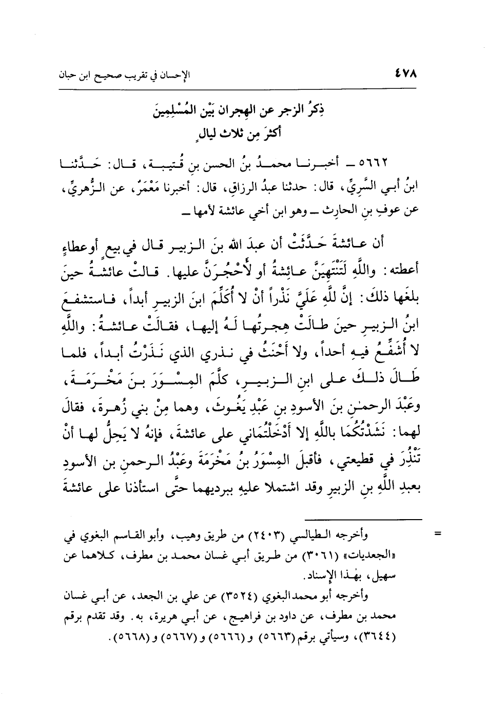 5662 - أَخْبَرَنَا مُحَمَّدُ بْنُ الْحَسَنِ بْنِ قُتَيْبَةَ، قَالَ: حَدَّثَنَا ابْنُ أَبِي السَّرِيِّ، قَالَ: حَدَّثَنَا عَبْدُ الرَّزَّاقِ، قَالَ: أَخْبَرَنَا مَعْمَرٌ، عَنِ الزُّهْرِيِّ، عَنْ عَوْفِ بْنِ الْحَارِثِ وَهُوَ ابْنُ أَخِي عَائِشَةَ لِأُمِّهَا- أَنَّ عَائِشَةَ حَدَّثَتْ أَنَّ عَبْدَ اللَّهِ بْنَ الزُّبَيْرِ قَالَ فِي بَيْعٍ أَوْ عَطَاءٍ أَعْطَتْهُ: وَاللَّهِ لَتَنْتَهِيَنَّ عَائِشَةُ أَوْ لَأَحْجُرَنَّ عَلَيْهَا، قَالَتْ عَائِشَةُ حِينَ بَلَغَهَا ذَلِكَ: إِنَّ لِلَّهِ عَلَيَّ نَذْرًا أَنْ لَا أُكَلِّمَ ابْنَ الزُّبَيْرِ أَبَدًا، فَاسْتَشْفَعَ ابْنَ الزُّبَيْرِ حِينَ طَالَتْ هِجْرَتُهَا لَهُ إِلَيْهَا، فَقَالَتْ عَائِشَةُ: وَاللَّهِ لَا أُشَفِّعُ فِيهِ أَحَدًا وَلَا أَحْنَثُ فِي نَذْرِي الَّذِي نَذَرْتُ أَبَدًا، فَلَمَّا طَالَ ذَلِكَ عَلَى ابْنِ الزُّبَيْرِ كَلَّمَ الْمِسْوَرَ بْنَ مَخْرَمَةَ وَعَبْدَ الرَّحْمَنِ بْنَ الْأَسْوَدِ بْنِ عَبْدِ يَغُوثَ، وَهُمَا مِنْ بَنِي زُهْرَةَ، فَقَالَ لَهُمَا: نَشَدْتُكُمَا بِاللَّهِ إِلَّا أَدْخَلْتُمَانِي عَلَى عَائِشَةَ، فَإِنَّهُ لَا يَحِلُّ لَهَا أَنْ تَنْذِرَ فِي قَطِيعَتِي، فَأَقْبَلَ الْمِسْوَرُ بْنُ مَخْرَمَةَ وَعَبْدُ الرَّحْمَنِ بْنُ الْأَسْوَدِ بِعَبْدِ اللَّهِ بْنِ الزُّبَيْرِ وَقَدِ اشْتَمَلَا عَلَيْهِ بِبُرْدَيْهِمَا حَتَّى اسْتَأْذَنَا عَلَى عَائِشَةَ