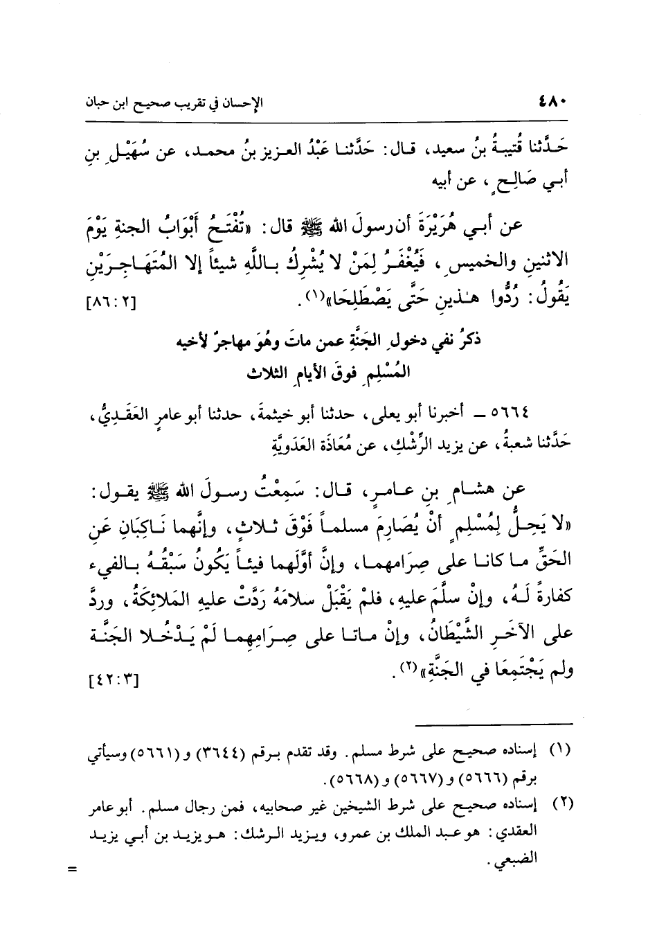 5664 - أَخْبَرَنَا أَبُو يَعْلَى، حَدَّثَنَا أَبُو خَيْثَمَةَ، حَدَّثَنَا أَبُو عَامِرٍ الْعَقَدِيُّ، حَدَّثَنَا شُعْبَةُ، عَنْ يَزِيدَ الرِّشْكِ، عَنْ مُعَاذَةَ الْعَدَوِيَّةِ عَنْ هِشَامِ بْنِ عَامِرٍ، قَالَ: سَمِعْتُ رَسُولَ اللَّهِ صَلَّى اللَّهُ عَلَيْهِ وَسَلَّمَ يَقُولُ: «لَا يَحِلُّ لِمُسْلِمٍ أَنْ يُصَارِمَ مُسْلِمًا فَوْقَ ثَلَاثٍ، وَإِنَّهُمَا نَاكِبَانِ عَنِ الْحَقِّ مَا كَانَا عَلَى صِرَامِهِمَا، وَإِنَّ أَوَّلَهُمَا فَيْئًا يَكُونُ سَبْقُهُ بِالْفَيْءِ كَفَّارَةً لَهُ، وَإِنْ سَلَّمَ عَلَيْهِ، فَلَمْ يَقْبَلْ سَلَامَهُ رَدَّتْ عَلَيْهِ الْمَلَائِكَةُ، وَرَدَّ عَلَى الْآخَرِ الشَّيْطَانُ، وَإِنْ مَاتَا عَلَى صِرَامِهِمَا لَمْ يَدْخُلَا الْجَنَّةَ وَلَمْ يَجْتَمِعَا فِي الْجَنَّةِ» (¬2) . [3: 42]