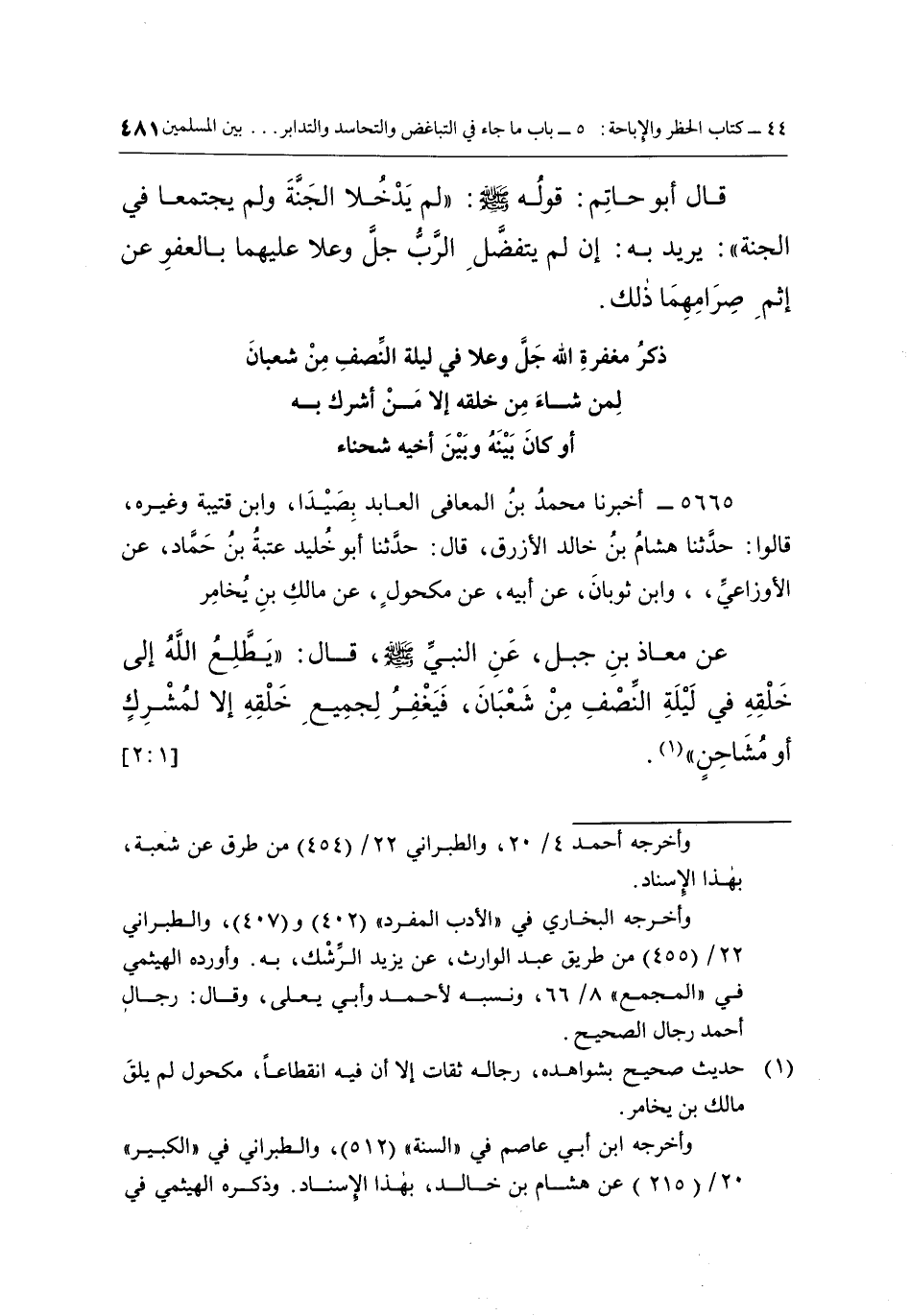 5665 - أَخْبَرَنَا مُحَمَّدُ بْنُ الْمُعَافَى الْعَابِدُ بِصَيْدَا، وَابْنُ قُتَيْبَةَ وَغَيْرُهُ، قَالُوا: حَدَّثَنَا هِشَامُ بْنُ خَالِدٍ الْأَزْرَقُ، قَالَ: حَدَّثَنَا أَبُو خُلَيْدٍ عُتْبَةُ بْنُ حَمَّادٍ، عَنِ الْأَوْزَاعِيِّ، وَابْنِ ثَوْبَانَ، عَنْ أَبِيهِ، عَنْ مَكْحُولٍ، عَنْ مَالِكِ بْنِ يُخَامِرَ عَنْ مُعَاذِ بْنِ جَبَلٍ، عَنِ النَّبِيِّ صَلَّى اللَّهُ عَلَيْهِ وَسَلَّمَ قَالَ: «يَطْلُعُ اللَّهُ إِلَى خَلْقِهِ فِي لَيْلَةِ النِّصْفِ مِنْ شَعْبَانَ فَيَغْفِرُ لِجَمِيعِ خَلْقِهِ إِلَّا لِمُشْرِكٍ أَوْ مُشَاحِنٍ» (¬1) . [1: 2]