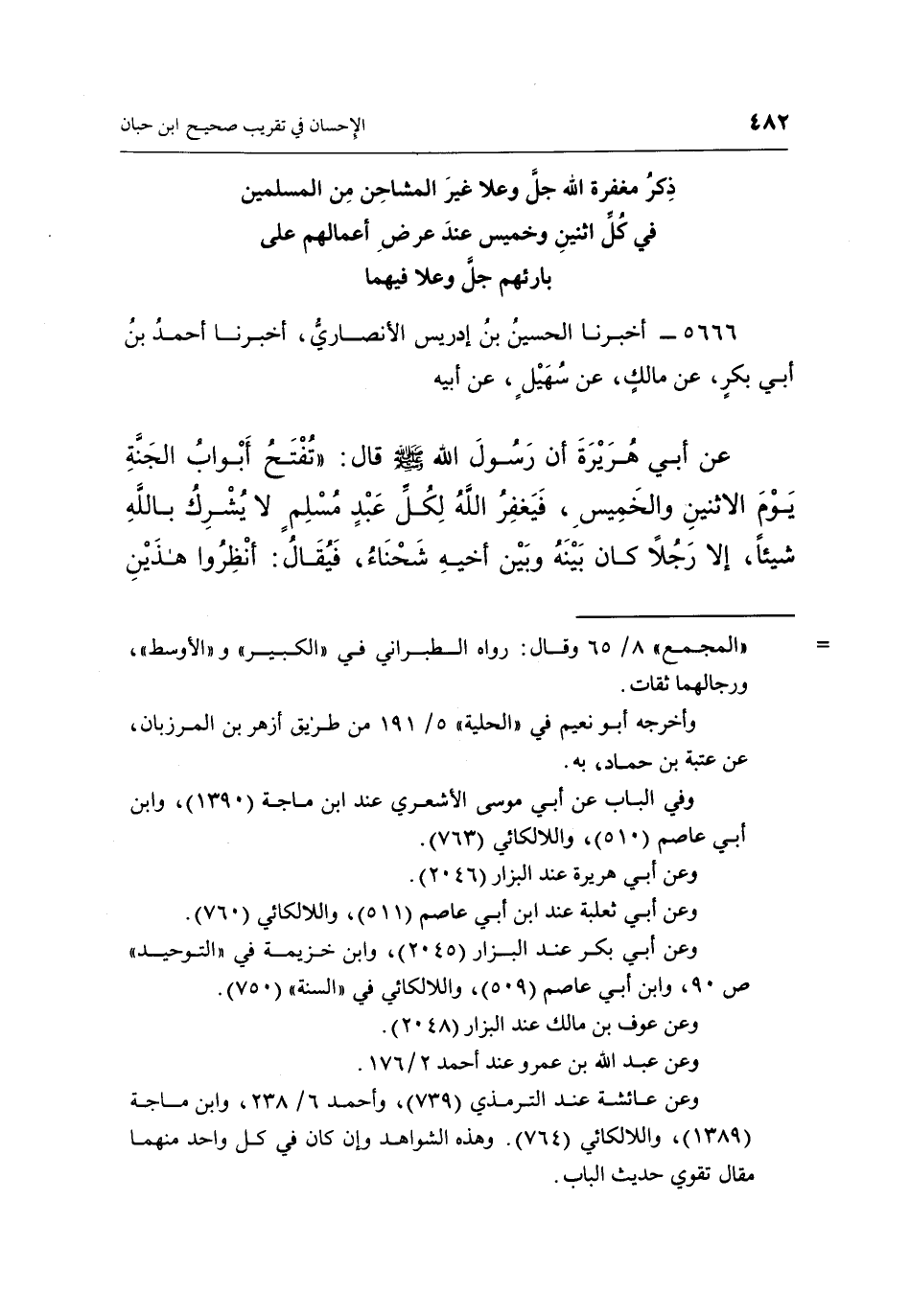 5666 - أَخْبَرَنَا الْحُسَيْنُ بْنُ إِدْرِيسَ الْأَنْصَارِيُّ، أَخْبَرَنَا أَحْمَدُ بْنُ أَبِي بَكْرٍ، عَنْ مَالِكٍ، عَنْ سُهَيْلٍ، عَنْ أَبِيهِ عَنْ أَبِي هُرَيْرَةَ، أَنَّ رَسُولَ اللَّهِ صَلَّى اللَّهُ عَلَيْهِ وَسَلَّمَ قَالَ: «تُفْتَحُ أَبْوَابُ الْجَنَّةِ يَوْمَ الِاثْنَيْنِ وَالْخَمِيسِ، فَيَغْفِرُ اللَّهُ لِكُلِّ عَبْدٍ مُسْلِمِ لَا يُشْرِكُ بِاللَّهِ شَيْئًا، إِلَّا رَجُلًا كَانَ بَيْنَهُ وَبَيْنَ أَخِيهِ شَحْنَاءُ، فَيُقَالُ: أَنْظِرُوا هَذَيْنِ