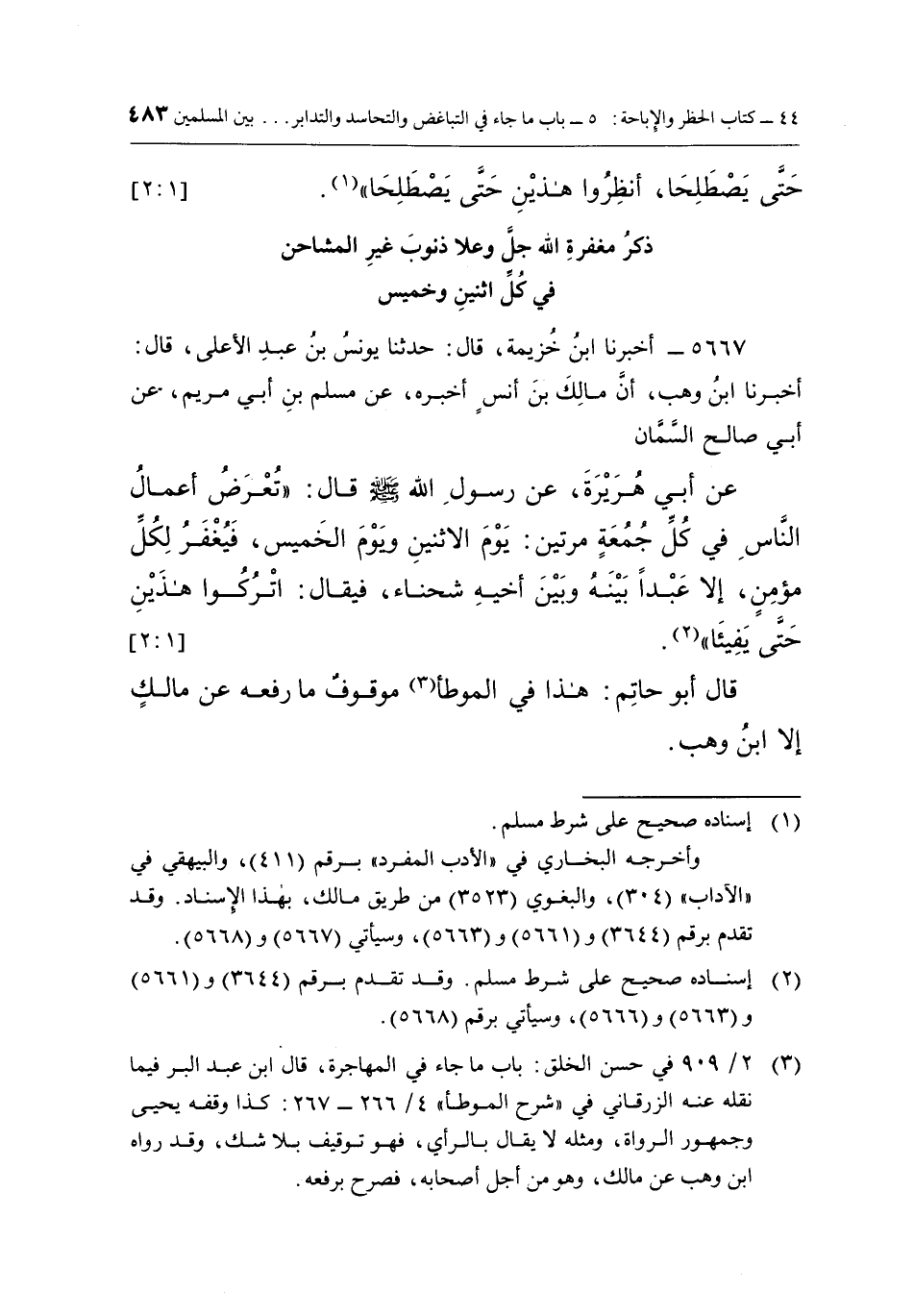 5667 - أَخْبَرَنَا ابْنُ خُزَيْمَةَ، قَالَ: حَدَّثَنَا يُونُسُ بْنُ عَبْدِ الْأَعْلَى، قَالَ: أَخْبَرَنَا ابْنُ وَهْبٍ، أَنَّ مَالِكَ بْنَ أَنَسٍ، أَخْبَرَهُ عَنْ مُسْلِمِ بْنِ أَبِي مَرْيَمَ، عَنْ أَبِي صَالِحٍ السَّمَّانِ عَنْ أَبِي هُرَيْرَةَ، عَنْ رَسُولِ اللَّهِ صَلَّى اللَّهُ عَلَيْهِ وَسَلَّمَ قَالَ: «تُعْرَضُ أَعْمَالُ النَّاسِ فِي كُلِّ جُمُعَةٍ مَرَّتَيْنِ: يَوْمَ الِاثْنَيْنِ وَيَوْمَ الْخَمِيسِ، فَيُغْفَرُ لِكُلِّ مُؤْمِنٍ إِلَّا عَبْدًا بَيْنَهُ وَبَيْنَ أَخِيهِ شَحْنَاءُ، فَيُقَالُ: اتْرُكُوا هَذَيْنِ حَتَّى يَفِيئَا» (¬2) . [1: 2]