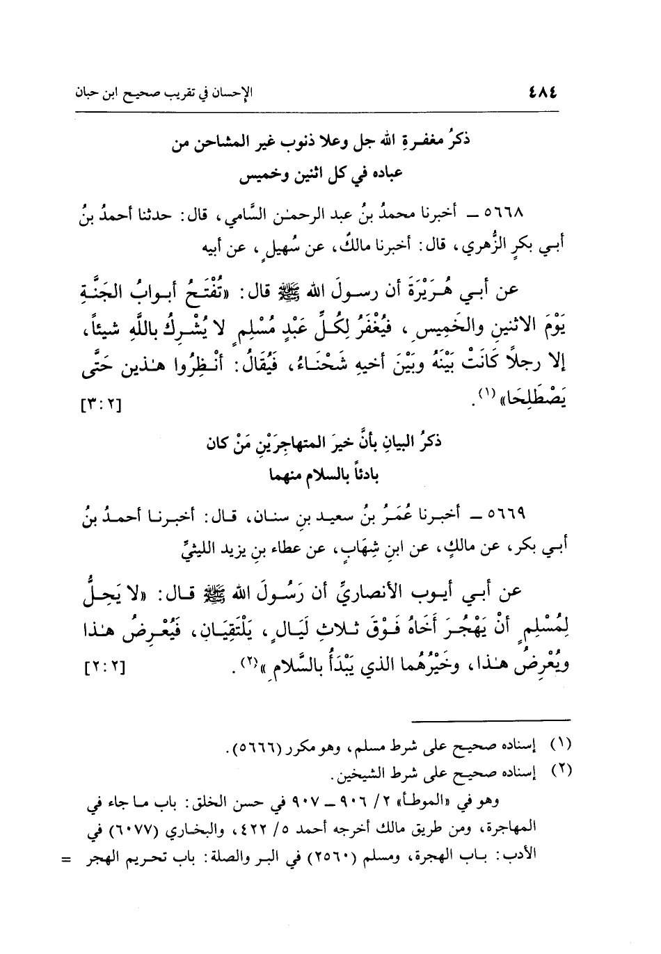 5669 - أَخْبَرَنَا عُمَرُ بْنُ سَعِيدِ بْنِ سِنَانٍ، قَالَ: أَخْبَرَنَا أَحْمَدُ بْنُ أَبِي بَكْرٍ، عَنْ مَالِكٍ، عَنِ ابْنِ شِهَابٍ، عَنْ عَطَاءِ بْنِ يَزِيدَ اللَّيْثِيِّ عَنْ أَبِي أَيُّوبَ الْأَنْصَارِيِّ، أَنَّ رَسُولَ اللَّهِ صَلَّى اللَّهُ عَلَيْهِ وَسَلَّمَ قَالَ: «لَا يَحِلُّ لِمُسْلِمٍ أَنْ يَهْجُرَ أَخَاهُ فَوْقَ ثَلَاثِ لَيَالٍ، يَلْتَقِيَانِ فَيُعْرِضُ هَذَا وَيُعْرِضُ هَذَا، وَخَيْرُهُمَا الَّذِي يَبْدَأُ بِالسَّلَامِ» (¬2) . [2: 2]