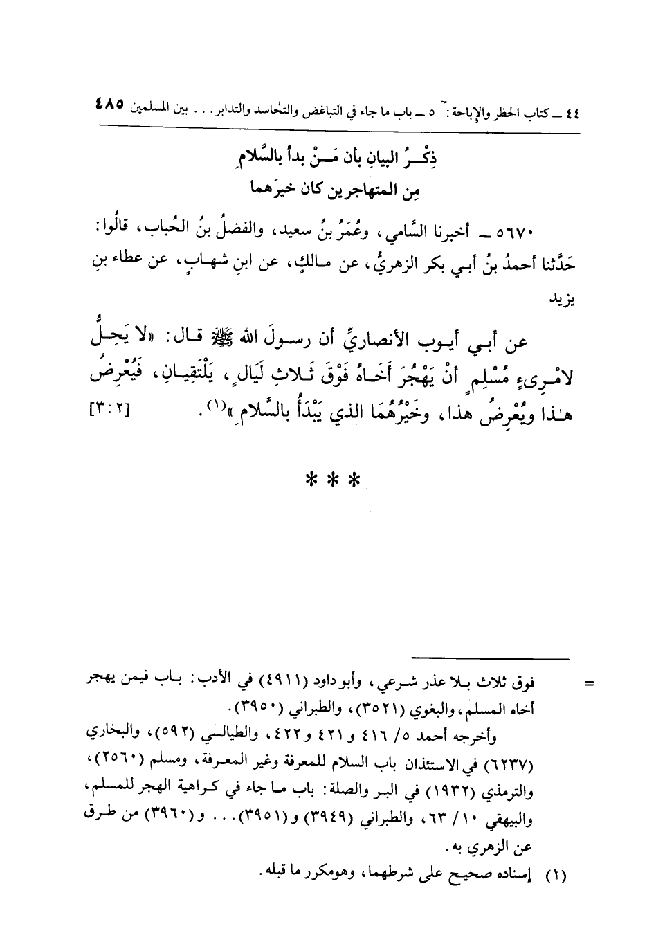 5670 - أَخْبَرَنَا السَّامِيُّ، وَعُمَرُ بْنُ سَعِيدٍ، وَالْفَضْلُ بْنُ الْحُبَابِ، قَالُوا: حَدَّثَنَا أَحْمَدُ بْنُ أَبِي بَكْرٍ الزُّهْرِيِّ، عَنْ مَالِكٍ، عَنِ ابْنِ شِهَابٍ، عَنْ عَطَاءِ بْنِ يَزِيدَ عَنْ أَبِي أَيُّوبَ الْأَنْصَارِيِّ، أَنَّ رَسُولَ اللَّهِ صَلَّى اللَّهُ عَلَيْهِ وَسَلَّمَ قَالَ: «لَا يَحِلُّ لِامْرِئٍ مُسْلِمٍ أَنْ يَهْجُرَ أَخَاهُ فَوْقَ ثَلَاثِ لَيَالٍ، يَلْتَقِيَانِ فَيُعْرِضُ هَذَا وَيُعْرِضُ هَذَا، وَخَيْرُهُمَا الَّذِي يَبْدَأُ بِالسَّلَامِ» (¬1) . [2: 3]