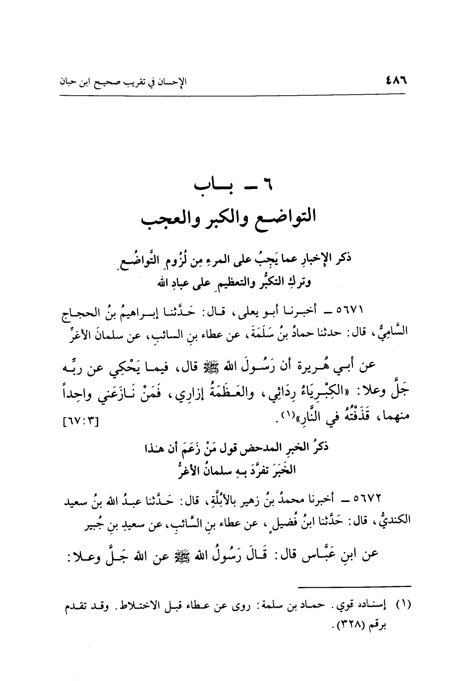5671 - أَخْبَرَنَا أَبُو يَعْلَى، قَالَ: حَدَّثَنَا إِبْرَاهِيمُ بْنُ الْحَجَّاجِ السَّامِيُّ، قَالَ: حَدَّثَنَا حَمَّادُ بْنُ سَلَمَةَ، عَنْ عَطَاءِ بْنِ السَّائِبِ، عَنْ سَلْمَانَ الْأَغَرِّ عَنْ أَبِي هُرَيْرَةَ، أَنَّ رَسُولَ اللَّهِ صَلَّى اللَّهُ عَلَيْهِ وَسَلَّمَ قَالَ فِيمَا يَحْكِي عَنْ رَبِّهِ جَلَّ وَعَلَا: «الْكِبْرِيَاءُ رِدَائِي وَالْعَظَمَةُ إِزَارِي، فَمَنْ نَازَعَنِي وَاحِدًا مِنْهُمَا قَذَفْتُهُ فِي النَّارِ» (¬1) . [3: 67]