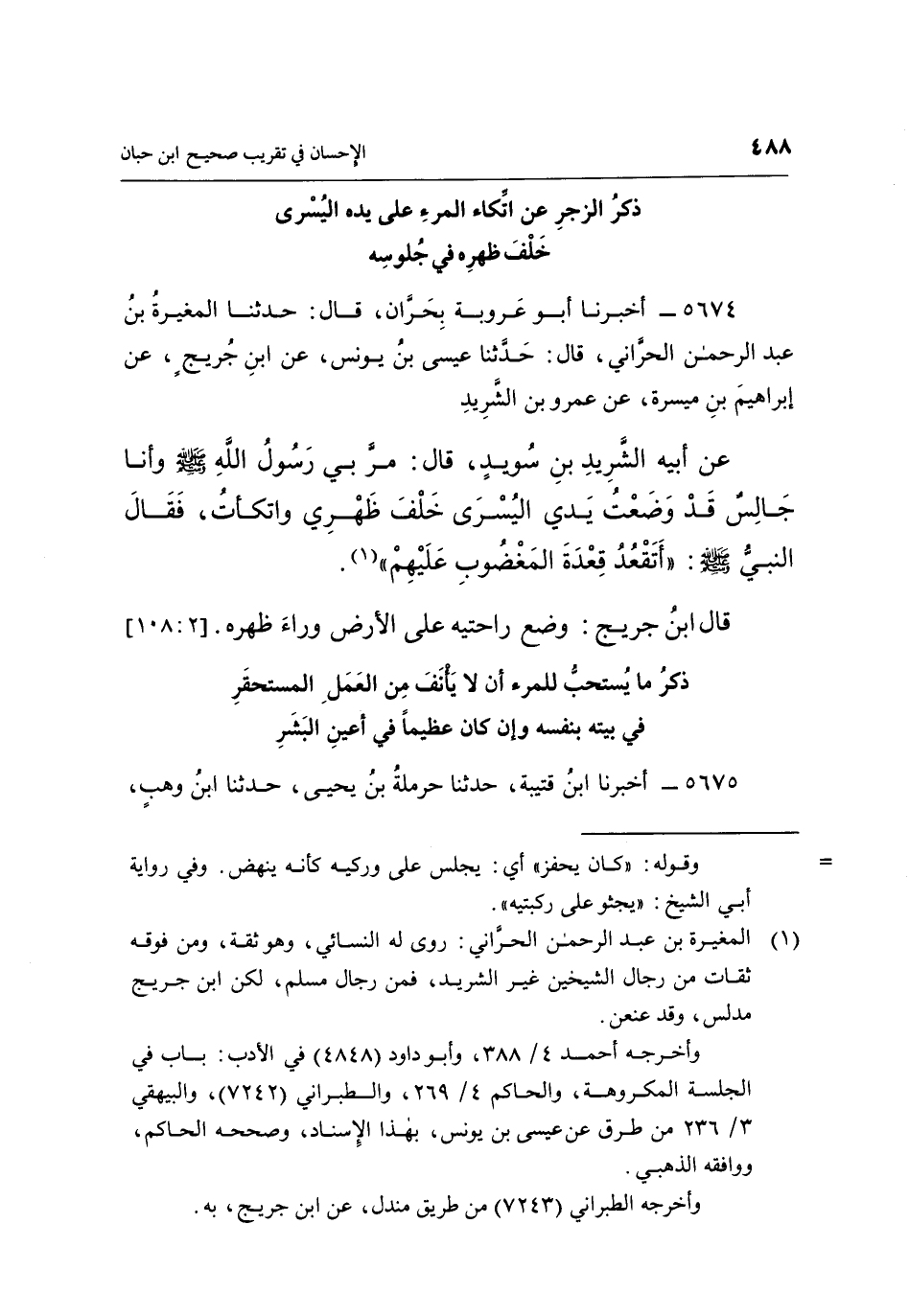 5674 - أَخْبَرَنَا أَبُو عَرُوبَةَ، بِحَرَّانَ، قَالَ: حَدَّثَنَا الْمُغِيرَةُ بْنُ عَبْدِ الرَّحْمَنِ الْحَرَّانِيُّ، قَالَ: حَدَّثَنَا عِيسَى بْنُ يُونُسَ، عَنِ ابْنِ جُرَيْجٍ، عَنْ إِبْرَاهِيمَ بْنِ مَيْسَرَةَ، عَنْ عَمْرِو بْنِ الشَّرِيدِ عَنْ أَبِيهِ الشَّرِيدِ بْنِ سُوَيْدٍ، قَالَ: مَرَّ بِي رَسُولُ اللَّهِ صَلَّى اللَّهُ عَلَيْهِ وَسَلَّمَ وَأَنَا جَالِسٌ قَدْ وَضَعْتُ يَدِي الْيُسْرَى خَلْفَ ظَهْرِي وَاتَّكَأْتُ، فَقَالَ النَّبِيُّ صَلَّى اللَّهُ عَلَيْهِ وَسَلَّمَ: «أَتَقْعُدُ قِعْدَةَ الْمَغْضُوبِ عَلَيْهِمْ» (¬1) .