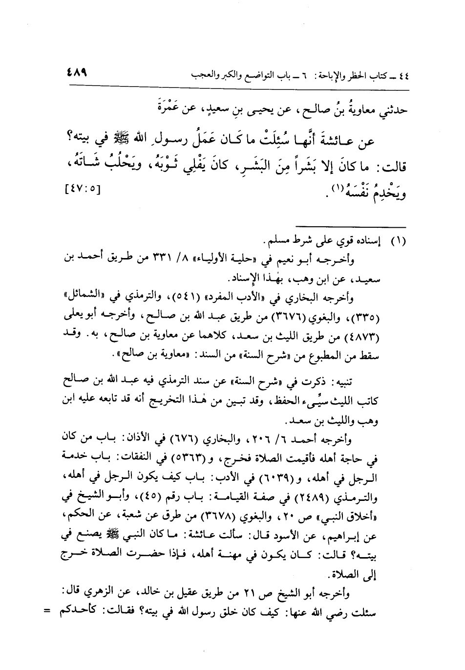حَدَّثَنِي مُعَاوِيَةُ بْنُ صَالِحٍ، عَنْ يَحْيَى بْنِ سَعِيدٍ، عَنْ عَمْرَةَ عَنْ عَائِشَةَ، أَنَّهَا سُئِلَتْ: مَا كَانَ عَمَلُ رَسُولِ اللَّهِ صَلَّى اللَّهُ عَلَيْهِ وَسَلَّمَ فِي بَيْتِهِ؟ قَالَتْ: «مَا كَانَ إِلَّا بَشَرًا مِنَ الْبَشَرِ، كَانَ يَفْلِي ثَوْبَهُ، وَيَحْلِبُ شَاتَهُ، وَيَخْدُمُ نَفْسَهُ» (¬1) . [5: 47]