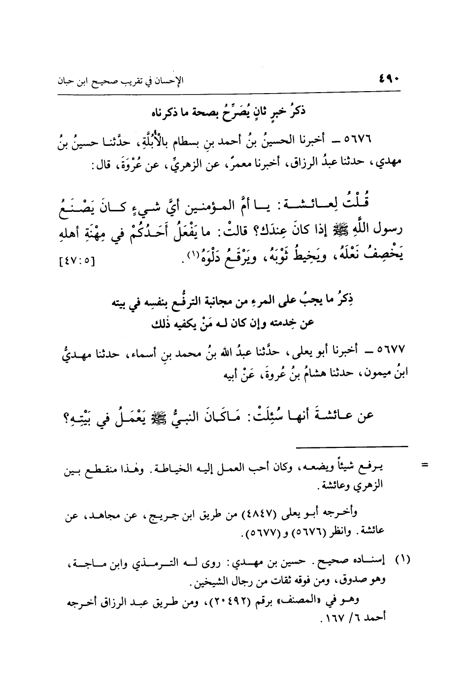 5676 - أَخْبَرَنَا الْحُسَيْنُ بْنُ أَحْمَدَ بْنِ بِسْطَامٍ، بِالْأَبُلَّةِ، حَدَّثَنَا حُسَيْنُ بْنُ مَهْدِيٍّ، حَدَّثَنَا عَبْدُ الرَّزَّاقِ، أَخْبَرَنَا مَعْمَرٌ، عَنِ الزُّهْرِيِّ، عَنْ عُرْوَةَ، قَالَ: قُلْتُ لِعَائِشَةَ: يَا أُمَّ الْمُؤْمِنِينَ، أَيُّ شَيْءٍ كَانَ يَصْنَعُ رَسُولُ اللَّهِ صَلَّى اللَّهُ عَلَيْهِ وَسَلَّمَ إِذَا كَانَ عِنْدَكِ؟ قَالَتْ: «مَا يَفْعَلُ أَحَدُكُمْ فِي مِهْنَةِ أَهْلِهِ، يَخْصِفُ نَعْلَهُ، وَيَخِيطُ ثَوْبَهُ، وَيَرْقَعُ دَلْوَهُ» (¬1) . [5: 47]