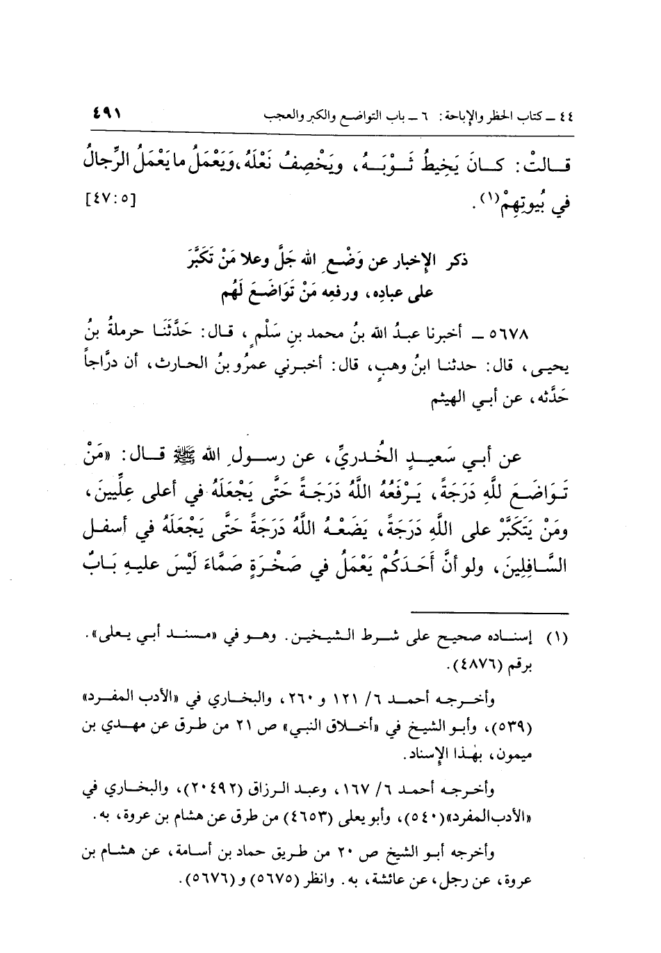5678 - أَخْبَرَنَا عَبْدُ اللَّهِ بْنُ مُحَمَّدِ بْنِ سَلْمٍ، قَالَ: حَدَّثَنَا حَرْمَلَةُ بْنُ يَحْيَى، قَالَ: حَدَّثَنَا ابْنُ وَهْبٍ، قَالَ: أَخْبَرَنِي عَمْرُو بْنُ الْحَارِثِ، أَنَّ دَرَّاجًا، حَدَّثَهُ عَنْ أَبِي الْهَيْثَمِ عَنْ أَبِي سَعِيدٍ الْخُدْرِيِّ، عَنْ رَسُولِ اللَّهِ صَلَّى اللَّهُ عَلَيْهِ وَسَلَّمَ قَالَ: «مَنْ تَوَاضَعَ لِلَّهِ دَرَجَةً يَرْفَعْهُ اللَّهُ دَرَجَةً، حَتَّى يَجْعَلَهُ فِي أَعْلَى عِلِّيِّينَ، وَمَنْ يَتَكَبَّرْ عَلَى اللَّهِ دَرَجَةً يَضَعْهُ اللَّهُ دَرَجَةً حَتَّى يَجْعَلَهُ فِي أَسْفَلِ السَّافِلِينَ، وَلَوْ أَنَّ أَحَدَكُمْ يَعْمَلُ فِي صَخْرَةٍ صَمَّاءَ لَيْسَ عَلَيْهِ بَابٌ