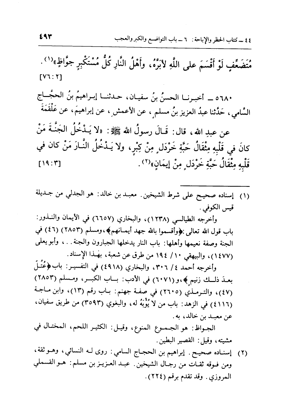 5680 - أَخْبَرَنَا الْحَسَنُ بْنُ سُفْيَانَ، حَدَّثَنَا إِبْرَاهِيمُ بْنُ الْحَجَّاجِ السَّامِيُّ، حَدَّثَنَا عَبْدُ الْعَزِيزِ بْنُ مُسْلِمٍ، عَنِ الْأَعْمَشِ، عَنْ إِبْرَاهِيمَ، عَنْ عَلْقَمَةَ، عَنْ عَبْدِ اللَّهِ، قَالَ: قَالَ رَسُولُ اللَّهِ صَلَّى اللَّهُ عَلَيْهِ وَسَلَّمَ: «لَا يَدْخُلُ الْجَنَّةَ مَنْ كَانَ فِي قَلْبِهِ مِثْقَالُ حَبَّةِ خَرْدَلٍ مِنْ كِبْرٍ، وَلَا يَدْخُلُ النَّارَ مَنْ كَانَ فِي قَلْبِهِ مِثْقَالُ حَبَّةِ خَرْدَلٍ مِنْ إِيمَانٍ» (¬2) . [3: 19]