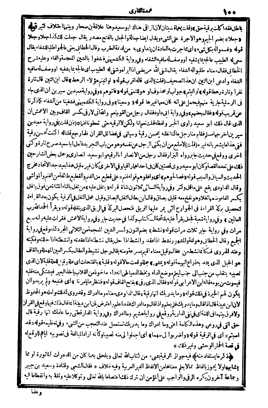 بَاطِل فقد أكلت برقية حق " (قلت) هما قضيتان لِأَن الراقي هُنَاكَ أَبُو سعيد وَهنا علاقَة بن صحار وَبَينهمَا اخْتِلَاف كثير قَوْله " جعلا " بِضَم الْجِيم وَهُوَ الْأُجْرَة على الشَّيْء وَيُقَال أَيْضا جعَالَة والجعل بِالْفَتْح مصدر يُقَال جعلت لَك كَذَا جعلا وَجعلا قَوْله " فسعوا لَهُ بِكُل شَيْء " أَي مِمَّا جرت بِهِ الْعَادة أَن يتداوى بِهِ من لدغة الْعَقْرَب وَقَالَ الْخطابِيّ يَعْنِي عالجوا طلبا للشفاء يُقَال سعى لَهُ الطَّبِيب عالجه بِمَا يشفيه أَو وصف لَهُ مَا فِيهِ الشِّفَاء وَفِي رِوَايَة الْكشميهني فشفوا بالشين الْمُعْجَمَة وَالْفَاء وَعَلِيهِ شرح الْخطابِيّ فَقَالَ مَعْنَاهُ طلبُوا لَهُ الشِّفَاء يُقَال شفى الله مريضي إِذا أَبرَأَهُ وشفى لَهُ الطَّبِيب أَي عالجه بِمَا يشفيه أَو وصف لَهُ مَا فِيهِ الشِّفَاء وَادّعى ابْن التِّين أَن هَذَا تَصْحِيف (قلت) الَّذِي قَالَه أقرب قَوْله " لَو أتيتم هَؤُلَاءِ الرَّهْط " قَالَ ابْن التِّين قَالَ تَارَة نَفرا وَتارَة رهطا قَوْله " لَو أتيتم " جَوَاب لَو مَحْذُوف أَو هُوَ لِلتَّمَنِّي قَوْله " فأتوهم " وَفِي رِوَايَة معبد بن سِيرِين أَن الَّذِي جَاءَ فِي الرسلية جَارِيَة مِنْهُم فَيحمل على أَنه كَانَ مَعهَا غَيرهَا قَوْله " وسعينا " وَفِي رِوَايَة الْكشميهني فشفينا من الشِّفَاء كَمَا ذكرنَا عَن قريب قَوْله " فَقَالَ بَعضهم " وَفِي رِوَايَة أبي دَاوُد فَقَالَ رجل من الْقَوْم نعم وَالله إِنِّي لأرقي بِكَسْر الْقَاف وَبَين الْأَعْمَش أَن الَّذِي قَالَ ذَلِك أَبُو سعيد رَاوِي الْخَبَر وَلَفظه قلت نعم أَنا وَلَكِن لَا أرقيه حَتَّى تعطونا غنما (فَإِن قلت) فِي رِوَايَة معبد بن سِيرِين أخرجهَا مُسلم فَقَامَ منا رجل مَا كُنَّا نظنه يحسن رقية وَسَيَأْتِي فِي فَضَائِل الْقُرْآن فَلَمَّا رَجَعَ قُلْنَا لَهُ أَكنت تحسن رقية فَفِي هَذَا مَا يشْعر بِأَنَّهُ غَيره (قلت) لَا مَانع من أَن يكنى الرجل عَن نَفسه وَهُوَ من بَاب التَّجْرِيد فَلَعَلَّ أَبَا سعيد صرح تَارَة وكنى أُخْرَى وَوَقع فِي حَدِيث جَابر رَوَاهُ الْبَزَّار فَقَالَ رجل من الْأَنْصَار أَنا أرقيه وَأَبُو سعيد أَنْصَارِي وَحمل بعض الشَّارِحين ذَلِك على تعدد الْقِصَّة وَكَانَ أَبُو سعيد روى قصتين كَانَ فِي إِحْدَاهمَا راقيا وَفِي الْأُخْرَى كَانَ غَيره قيل هَذَا بعيد جدا لِاتِّحَاد مخرج الحَدِيث والسياق وَالسَّبَب قَوْله " فصالحوهم " أَي وافقوهم قَوْله " غنم " على قطيع من الْغنم والقطيع طَائِفَة من الْغنم والمواشي وَقَالَ الدَّاودِيّ يَقع على مَا قل وَكثر وَفِي رِوَايَة النَّسَائِيّ ثَلَاثُونَ شَاة قَوْله " يتفل عَلَيْهِ " من تفل بِالتَّاءِ الْمُثَنَّاة من فَوق يتفل بِكَسْر الْفَاء وَضمّهَا تفلا وَهُوَ نفخ مَعَه قَلِيل بصاق وَقَالَ ابْن بطال التفل البصاق وَقيل مَحل التفل فِي الرّقية يكون بعد الْقِرَاءَة لتَحْصِيل بركَة الْقِرَاءَة فِي الْجَوَارِح الَّتِي يمر عَلَيْهَا الرِّيق فَتحصل الْبركَة فِي الرِّيق الَّذِي يتفله قَوْله " وَيقْرَأ الْحَمد لله رب الْعَالمين " وَفِي رِوَايَة شُعْبَة فَجعل يقْرَأ عَلَيْهِ بِفَاتِحَة الْكتاب وَكَذَا فِي حَدِيث جَابر وَفِي رِوَايَة الْأَعْمَش فَقَرَأت عَلَيْهِ وَأَنه سبع مَرَّات وَفِي رِوَايَة جَابر ثَلَاث مَرَّات قَوْله " نشط " بِضَم النُّون وَكسر الشين الْمُعْجَمَة من الثلاثي الْمُجَرّد كَذَا وَقع فِي رِوَايَة الْجَمِيع وَقَالَ الْخطابِيّ وَهُوَ لُغَة وَالْمَشْهُور نشط إِذا عقد وَأنْشط إِذا حل يُقَال نشطته إِذا عقدته وأنشطته إِذا حللته وفكيته وَعند الْهَرَوِيّ فَكَأَنَّمَا نشط من عقال وَقيل مَعْنَاهُ أقيم بِسُرْعَة وَمِنْه يُقَال رجل نشيط والعقال بِكَسْر الْعين الْمُهْملَة وبالقاف هُوَ الْحَبل الَّذِي يشد بِهِ ذِرَاع الْبَهِيمَة قَوْله " يمشي " جملَة وَقعت حَالا قَوْله " قلبة " بالفتحات أَي 