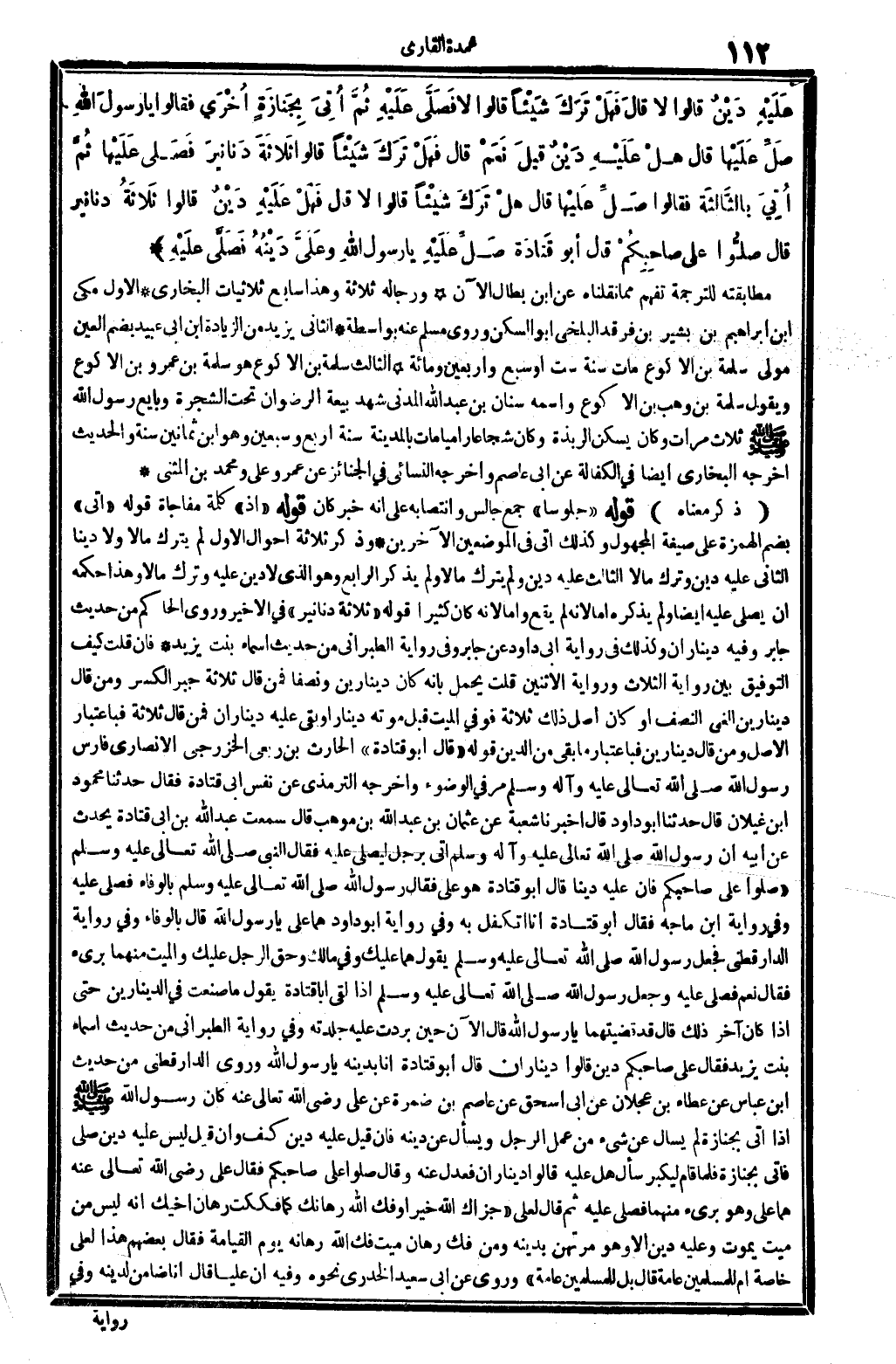عَلَيْهِ دَيْنٌ قالُوا لَا قَالَ فَهَلْ ترَكَ شَيْئا قَالُوا لاَ فَصَلَّى عليهِ ثُمَّ أُتِيَ بِجَنَازَةٍ أُخْرَى فَقَالُوا يَا رسولَ الله صلِّ عَلَيْهَا قَالَ هلْ عَلَيْها دَيْنٌ قَالَ نعَمْ قالْ فهَلْ تَرَكَ شَيْئا قَالُوا ثَلاثَةَ دَنانِيرَ فصَلَّى عَلَيْها ثُمَّ أُتِيَ بالثَّالِثَةِ فَقَالُوا صَلِّ عَلَيْها قَالَ هَلْ تَرَكَ شَيئا قَالُوا لاَ قَالَ فَهَلْ عَلَيْهِ دَيْنٌ قَالُوا ثَلاثَةُ دَنانِير قَالَ صلُّوا عَلَى صاحِبِكُمْ قَالَ أَبُو قَتادَةَ صلِّ علَيْهِ يَا رسولَ الله وعلَيَّ دَيْنَهُ فَصَلَّى عَلَيْهِ. (الحَدِيث 9822 طرفه فِي: 5922) .