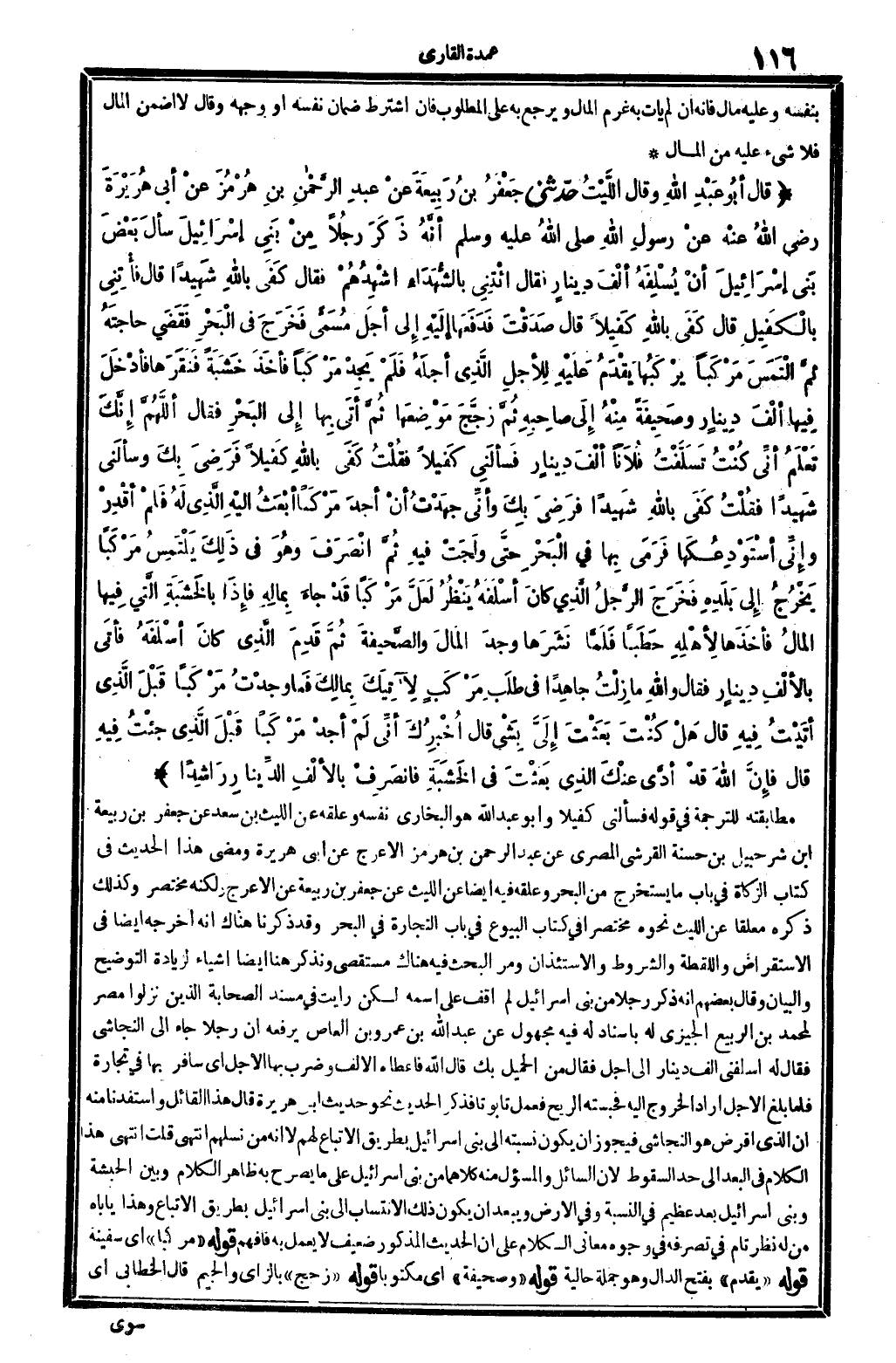 (قَالَ أَبُو عبد الله وَقَالَ اللَّيْث حَدثنِي جَعْفَر بن ربيعَة عَن عبد الرَّحْمَن بن هُرْمُز عَن أبي هُرَيْرَة رَضِي الله عَنهُ عَن رَسُول الله - صَلَّى اللَّهُ عَلَيْهِ وَسَلَّم َ - أَنه ذكر رجلا من بني إِسْرَائِيل سَأَلَ بعض بني إِسْرَائِيل أَن يسلفه ألف دِينَار فَقَالَ ائْتِنِي بِالشُّهَدَاءِ أشهدهم فَقَالَ كفى بِاللَّه شَهِيدا قَالَ فأتني بالكفيل قَالَ كفى بِاللَّه كَفِيلا قَالَ صدقت فَدَفعهَا إِلَيْهِ إِلَى أجل مسلمى فَخرج فِي الْبَحْر فَقضى حَاجته ثمَّ التمس مركبا يركبهَا يقدم عَلَيْهِ للأجل الَّذِي أَجله فَلم يجد مركبا فَأخذ خَشَبَة فنقرها فَأدْخل فِيهَا ألف دِينَار وصحيفة مِنْهُ إِلَى صَاحبه ثمَّ زجج موضعهَا ثمَّ أَتَى بهَا إِلَى الْبَحْر فَقَالَ اللَّهُمَّ إِنَّك تعلم أَنِّي كنت تسلفت فلَانا ألف دِينَار فَسَأَلَنِي كَفِيلا فَقلت كفى بِاللَّه كَفِيلا فَرضِي بك وسألني شَهِيدا فَقلت كفى بِاللَّه شَهِيدا فَرضِي بك وَأَنِّي جهدت أَن أجد مركبا أبْعث إِلَيْهِ الَّذِي لَهُ فَلم أقدر وَإِنِّي أستودعكها فَرمى بهَا فِي الْبَحْر حَتَّى ولجت فِيهِ ثمَّ انْصَرف وَهُوَ فِي ذَلِك يلْتَمس مركبا يخرج إِلَى بَلَده فَخرج الرجل الَّذِي كَانَ أسلفه ينظر لَعَلَّ مركبا قد جَاءَ بِمَالِه فَإِذا بالخشبة الَّتِي فِيهَا المَال فَأَخذهَا لأَهله حطبا فَلَمَّا نشرها وجد المَال والصحيفة ثمَّ قدم الَّذِي كَانَ أسلفه فَأتى بِالْألف دِينَار فَقَالَ وَالله مَا زلت جاهدا فِي طلب مركب لآتيك بِمَالك فَمَا وجدت مركبا قبل الَّذِي أتيت فِيهِ قَالَ هَل كنت بعثت إِلَيّ بِشَيْء قَالَ أخْبرك أَنِّي لم أجد مركبا قبل الَّذِي جِئْت فِيهِ قَالَ فَإِن الله قد أدّى عَنْك الَّذِي بعثت فِي الْخَشَبَة فَانْصَرف بِالْألف الدِّينَار راشدا) مطابقته للتَّرْجَمَة فِي قَوْله فَسَأَلَنِي كَفِيلا وَأَبُو عبد الله هُوَ البُخَارِيّ نَفسه وعلقه عَن اللَّيْث بن سعد عَن جَعْفَر بن ربيعَة ابْن شُرَحْبِيل بن حَسَنَة الْقرشِي الْمصْرِيّ عَن عبد الرَّحْمَن بن هُرْمُز الْأَعْرَج عَن أبي هُرَيْرَة وَمضى هَذَا الحَدِيث فِي كتاب الزَّكَاة فِي بَاب مَا يسْتَخْرج من الْبَحْر وعلقه فِيهِ أَيْضا عَن اللَّيْث عَن جَعْفَر بن ربيعَة عَن الْأَعْرَج وَلكنه مُخْتَصر وَكَذَلِكَ ذكره مُعَلّقا عَن اللَّيْث نَحوه مُخْتَصرا فِي كتاب الْبيُوع فِي بَاب التِّجَارَة فِي الْبَحْر وَقد ذكرنَا هُنَاكَ أَنه أخرجه أَيْضا فِي الاستقراض واللقطة والشروط والاستئذان وَمر الْبَحْث فِيهِ هُنَاكَ مستقصى وَنَذْكُر هُنَا أَيْضا أَشْيَاء لزِيَادَة التَّوْضِيح وَالْبَيَان وَقَالَ بَعضهم أَنه ذكر رجلا من بني إِسْرَائِيل لم أَقف على اسْمه لَكِن رَأَيْت فِي مُسْند الصَّحَابَة الَّذين نزلُوا مصر لمُحَمد بن الرّبيع الجيزي لَهُ بِإِسْنَاد لَهُ فِيهِ مَجْهُول عَن عبد الله بن عَمْرو بن الْعَاصِ يرفعهُ أَن رجلا جَاءَ إِلَى النَّجَاشِيّ فَقَالَ لَهُ أَسْلفنِي ألف دِينَار إِلَى أجل فَقَالَ من الْحميل بك قَالَ الله فَأعْطَاهُ الْألف وَضرب بهَا الْأَجَل أَي سَافر بهَا فِي تِجَارَة فَلَمَّا بلغ الْأَجَل أَرَادَ الْخُرُوج إِلَيْهِ فحبسته الرّيح فَعمل تابوتا فَذكر الحَدِيث نَحْو حَدِيث أبي هُرَيْرَة قَالَ هَذَا الْقَائِل واستفدنا مِنْهُ أَن الَّذِي أقْرض هُوَ النَّجَاشِيّ فَيجوز أَن يكون نسبته إِلَى بني إِسْرَائِيل بطرِيق الِاتِّبَاع لَهُم لَا أَنه من نسلهم انْتهى قلت انْتهى هَذَا الْكَلَام فِي الْبعد إِلَى حد السُّقُوط لِأَن السَّائِل والمسؤل مِنْهُ كِلَاهُمَا من بني إِسْرَائِيل على مَا يُصَرح بِهِ ظَاهر الْكَلَام وَبَين الْحَبَشَة وَبني إِسْرَائِيل بعد عَظِيم فِي النِّسْبَة وَفِي الأَرْض وَيبعد أَن يكون ذَلِك الانتساب إِلَى بني إِسْرَائِيل بطرِيق الِاتِّبَاع وَهَذَا يأباه من لَهُ نظر تَامّ فِي تصرفه فِي