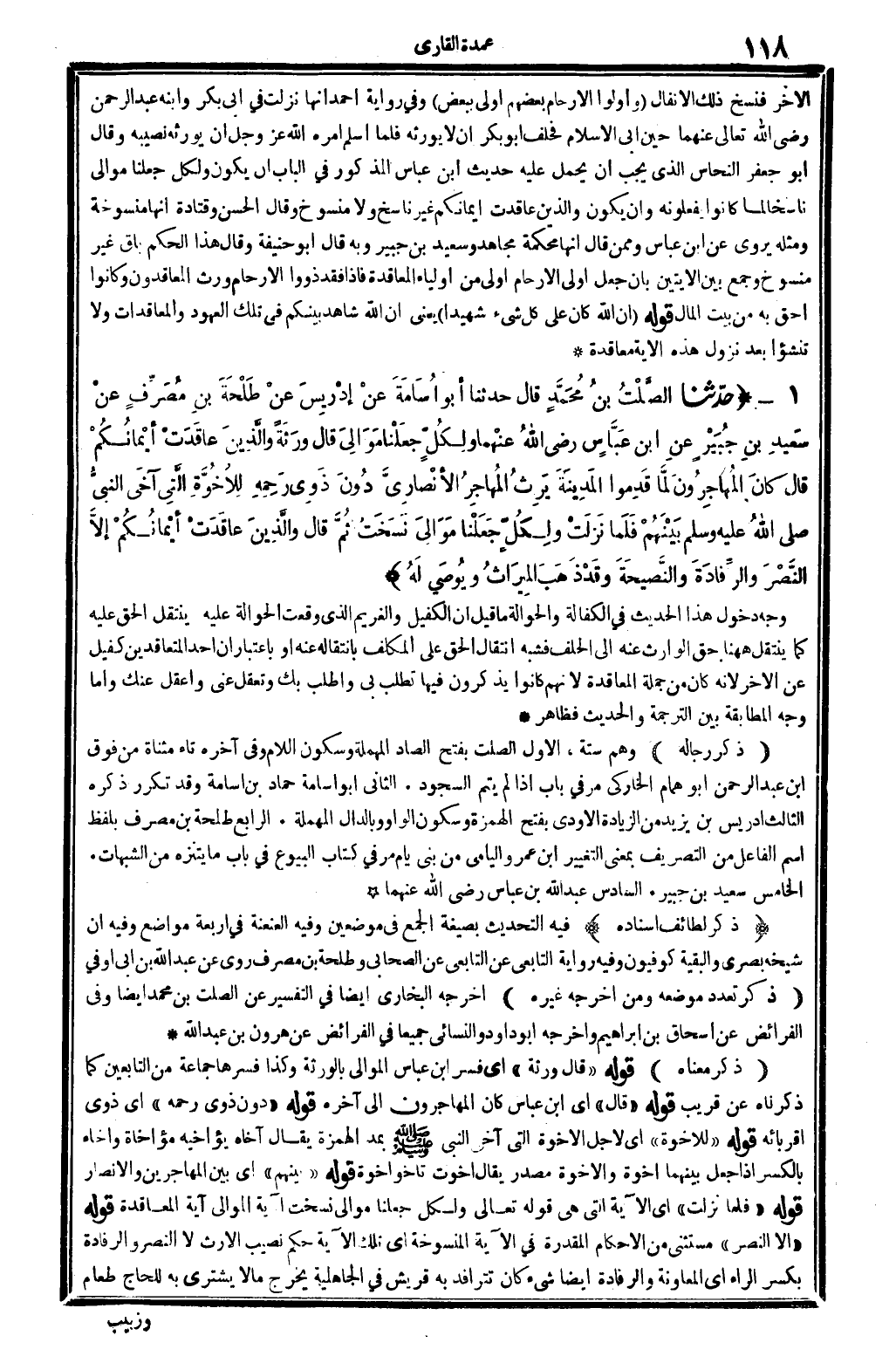 2922 - حدَّثنا الصَّلْتُ بنُ مُحَمَّدٍ قَالَ حَدثنَا أَبُو أُسامَةَ عنْ إدْرِيسَ عنْ طَلْحَةَ بنِ مُصَرِّفٍ عنْ سَعِيدِ بنِ جُبَيْرٍ عنِ ابنِ عَبَّاسٍ رَضِي الله تَعَالَى عَنْهُمَا {ولِكُلٍّ جَعَلْنَا مَوَالِيَ} (النِّسَاء: 33) . قَالَ ورَثَةً {والَّذِينَ عاقَدَتْ أيْمانُكُمْ} (النِّسَاء: 33) . قَالَ كانَ المُهَاجِرُونَ لَمَّا قَدِمُوا المَدِينَةَ يَرِثُ المُهَاجِرُ الأنْصَاريَّ دُونَ ذَوِي رَحِمِهِ لِلأُخُوَّةِ الَّتِي آخَى النبيُّ صلى الله عَلَيْهِ وَسلم بَيْنَهُمْ فلَمَّا نَزَلَتْ {ولِكُلٍّ جَعَلْنَا مَوَاليَ} (النِّسَاء: 33) . نَسَخَتْ ثُمَّ قَالَ {والَّذِينَ عاقَدَتْ أيْمَانُكُمْ} (النِّسَاء: 33) . إلاَّ النَّصْرَ والرِّفَادَةَ والنَّصِيحَةَ وقَدْ ذَهَبَ المِيرَاثُ ويُوصَى لَهُ.؟
