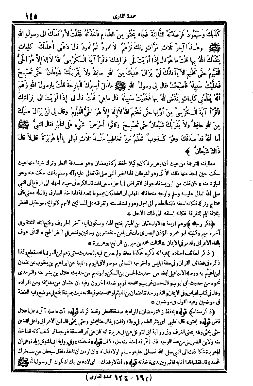 كَذَبَكَ وسَيَعُودُ فعَرَفْتُ أنَّهُ سَيَعُودُ لِقَوْلِ رَسُول الله صلى الله عَلَيْهِ وَسلم أنَّهُ سَيَعُودُ فرَصَدْتُهُ فَجاءَ يَحْثُو مِنَ الطَّعامِ فَأخَذْتُهُ فَقُلْتُ لأرْفَعَنَّكَ إِلَى رسولِ الله صلى الله عَلَيْهِ وَسلم قَالَ دَعْنِي فإنِّي محْتَاجٌ وعَلَيَّ عِيَالٌ لَا أعُودُ فَرَحِمْتُهُ فَخَلَّيْتُ سَبِيلَهُ فأصْبَحْتُ فقالَ لِي رسولُ الله صلى الله عَلَيْهِ وَسلم يَا أبَا هُرَيْرَةَ مَا فَعَلَ أسِيرُكَ قُلْتُ يَا رسولَ الله شَكَا حاجَةً شدِيدَةً وعِيالاً فرَحِمْتُهُ فَخَلَّيْتُ سَبيلهُ قَالَ أما أنَّهُ قَدْ كَذَبَكَ وسَيَعُودُ فَرَصَدْتُهُ: الثَّالِثةَ فجَاءَ يَحْثُو مِنَ الطَّعامِ فأخَذْتُهُ فَقُلْتُ لأَرْفَعَنَّكَ إلَى رسُولِ الله الله وهاذا آخِرُ ثَلاثِ مَرَّاتٍ إنَّكَ تَزْعَمُ لاَ تَعُودُ ثُمَّ تَعُودُ قالَ دَعْنِي أُعلِّمْكَ كلِماتٍ يَنْفَعُكَ الله بِهَا قُلْتُ مَا هْوَ قَالَ إذَا أوَيْتَ إلَى فِرَاشِك فاقْرَأْ آيَةَ الكُرْسِيَّ {الله لَا إلاهَ إلاَّ هُوَ الحَيُّ القَيُّومُ} حَتَّى تَخْتِم الآيَةَ فإنَّكَ لَنْ يَزَالَ عَلَيْكَ منَ الله حافِظُ ولاَ يَقْرَبَنَّكَ شَيْطَانٌ حَتَّى تُصْبِحَ فَخَلَّيْتُ سَبِيلَهُ فأصْبَحْتُ فَقَالَ لِي رَسُولُ الله صلى الله عَلَيْهِ وَسلم مَا فَعَلَ إسِيرُكَ الْبَارِحَةِ قلْتُ يَا رسولَ الله زَعَمَ أنَّهُ يُعَلِّمُني كَلِمَاتٍ يَنْفَعُنِي الله بهَا فَخَلَّيْتُ سَبِيلَهُ قَالَ مَا هِيَ قُلْتُ قَالَ لِي إذَا أَوَيْتَ إلَى فِرَاشِكَ فاقْرَأ آيَةَ الكُرْسيَّ مِنْ أوَّلِها حتَّى تَخْتِمَ الله لَا إلاه إلاَّ هُو الحَيُّ القَيُّومُ وَقَالَ لِي لَنْ يَزَالَ عَلَيْكَ مِنَ الله حافِظٌ ولاَ يَقْرَبُكَ شَيْطَانٌ حَتَّى تُصْبِحَ وكانُوا أحْرَصَ شَيْءٍ عَلَى الخَيْرِ فَقَالَ النبيُّ صلى الله عَلَيْهِ وَسلم أمَّا أنَّهُ قَدْ صَدَقَكَ وهْوَ كَذُوبٌ تَعْلَمُ مَنْ تُخَاطِبُ مُنْذُ ثَلاثِ لَيَالٍ يَا أَبَا هُرَيْرَةَ قَالَ لاَ قَالَ ذَاكَ شَيْطَانٌ.