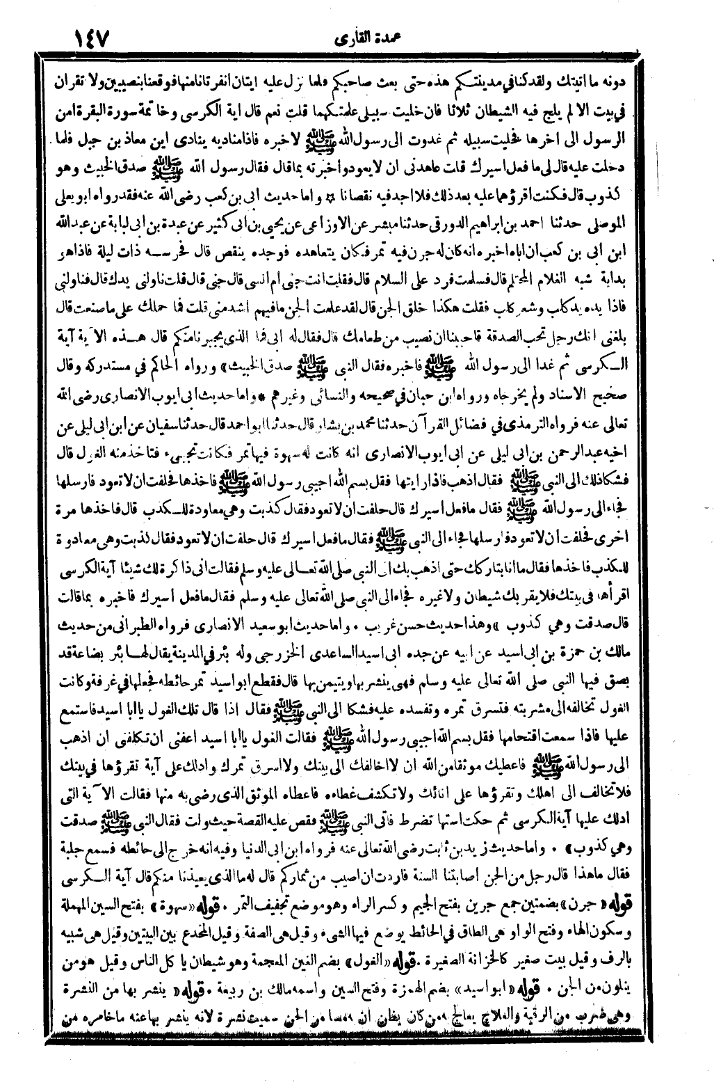 وَأما حَدِيث أبي أَيُّوب الْأنْصَارِيّ، رَضِي الله تَعَالَى عَنهُ، فَرَوَاهُ التِّرْمِذِيّ فِي (فَضَائِل الْقُرْآن) : (حَدثنَا مُحَمَّد بن بشار، قَالَ: حَدثنَا أَبُو أَحْمد، قَالَ: حَدثنَا سُفْيَان عَن ابْن أبي ليلى عَن أَخِيه عبد الرَّحْمَن بن أبي ليلى عَن أبي أَيُّوب الْأنْصَارِيّ أَنه كَانَت لَهُ سهوة فِيهَا تمر، فَكَانَت تَجِيء فتأخذ مِنْهُ الغول، قَالَ: فَشَكا ذَلِك إِلَى النَّبِي صلى الله عَلَيْهِ وَسلم، فَقَالَ: إذهب فَإِذا رَأَيْتهَا فَقل: بِسم الله، أجيبي رَسُول الله صلى الله عَلَيْهِ وَسلم، فَأَخذهَا فَحَلَفت أَن لَا تعود، فأرسلها فجَاء إِلَى رَسُول الله صلى الله عَلَيْهِ وَسلم فَقَالَ: مَا فعل أسيرك؟ قَالَ: حَلَفت أَن لَا تعود، فَقَالَ: كذبت وَهِي معاودة للكذب. قَالَ: فَأَخذهَا مرّة أُخْرَى فَحَلَفت أَن لَا تعود، فأرسلها، فجَاء إِلَى النَّبِي صلى الله عَلَيْهِ وَسلم فَقَالَ: مَا فعل أسيرك؟ قَالَ: حَلَفت أَن لَا تعود. فَقَالَ: كذبت وَهِي معاودة للكذب، فَأَخذهَا فَقَالَ: مَا أَنا بتاركك حَتَّى أذهب بك إِلَى النَّبِي، صلى الله عَلَيْهِ وَسلم، فَقَالَت: إِنِّي ذاكرة لَك شَيْئا، آيَة الْكُرْسِيّ اقرأها فِي بَيْتك فَلَا يقربك شَيْطَان وَلَا غَيره، فجَاء إِلَى النَّبِي، صلى الله عَلَيْهِ وَسلم، فَقَالَ: مَا فعل أسيرك؟ فَأخْبرهُ بِمَا قَالَت. قَالَ: صدقت وَهِي كذوب) ، وَهَذَا حَدِيث حسن غَرِيب.