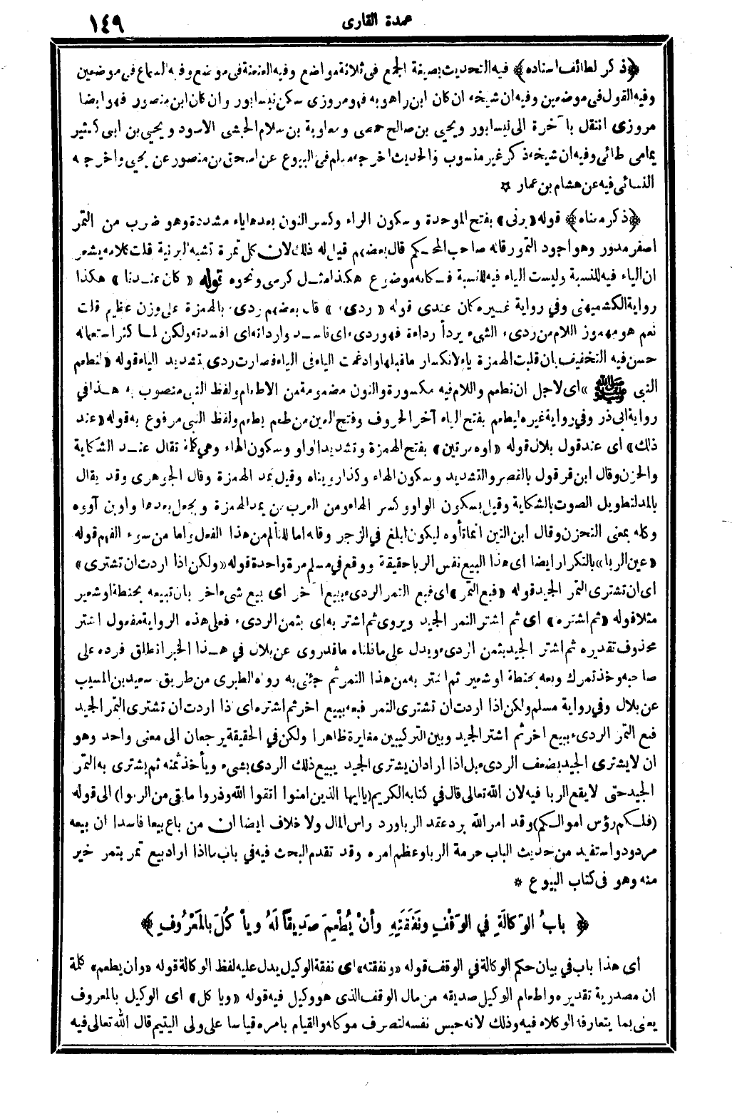 ذكر مَعْنَاهُ: قَوْله: (برني) ، بِفَتْح الْمُوَحدَة وَسُكُون الرَّاء وَكسر النُّون بعْدهَا يَاء مُشَدّدَة: وَهُوَ ضرب من التَّمْر أصفر مدور، وَهُوَ أَجود التمور، قَالَه صَاحب (الْمُحكم) : قَالَ بَعضهم: قيل لَهُ ذَلِك لِأَن كل تَمْرَة تشبه البرنية. قلت: كَلَامه يشْعر أَن الْيَاء فِيهِ للنسبة، وَلَيْسَت الْيَاء فِيهِ للنسبة، فَكَأَنَّهُ مَوْضُوع، هَكَذَا مثل كرْسِي وَنَحْوه. قَوْله: (كَانَ عندنَا) ، هَكَذَا رِوَايَة الْكشميهني، وَفِي رِوَايَة غَيره: كَانَ عِنْدِي. قَوْله: (رَدِيء) ، قَالَ بَعضهم: رَدِيء، بِالْهَمْزَةِ على وزن: عَظِيم. قلت: نعم هُوَ مَهْمُوز اللَّام من: ردىء الشَّيْء يردأ رداءة، فَهُوَ رَدِيء، أَي: فَاسد، وأردأته أَي: أفسدته، وَلَكِن لما كثر اسْتِعْمَاله حسن فِيهِ التَّخْفِيف بِأَن قلبت الْهمزَة يَاء لانكسار مَا قبلهَا وأدغمت الْيَاء فِي الْيَاء فَصَارَت: رديّ بتَشْديد الْيَاء. قَوْله: (لنطعم النَّبِي صلى الله عَلَيْهِ وَسلم) ، أَي: لأجل أَن نطعم، وَاللَّام فِيهِ مَكْسُورَة وَالنُّون مَضْمُومَة من الْإِطْعَام، وَلَفظ النَّبِي مَنْصُوب بِهِ، هَذَا فِي رِوَايَة أبي ذَر، وَفِي رِوَايَة غَيره: ليطعم، بِفَتْح الْيَاء آخر الْحُرُوف وَفتح الْعين من: طعم يطعم، وَلَفظ النَّبِي مَرْفُوع بِهِ. قَوْله: (عِنْد ذَلِك) ، أَي: عِنْد قَول بِلَال. قَوْله: (أوه) مرَّتَيْنِ، بِفَتْح الْهمزَة وَتَشْديد الْوَاو وَسُكُون الْهَاء، وَهِي كلمة تقال عِنْد الشكاية والحزن. وَقَالَ ابْن قرقول: بِالْقصرِ وَالتَّشْدِيد وَسُكُون الْهَاء، وَكَذَا روينَاهُ، وَقيل: بِمد الْهمزَة. وَقَالَ الْجَوْهَرِي: وَقد يُقَال بِالْمدِّ لتطويل الصَّوْت بالشكاية، وَقيل بِسُكُون الْوَاو وَكسر الْهَاء، وَمن الْعَرَب من يمد الْهمزَة وَيجْعَل بعْدهَا واوين: آووه، وَكله بِمَعْنى: التحزن، وَقَالَ ابْن التِّين: إِنَّمَا تأوه ليَكُون أبلغ فِي الزّجر، وَقَالَهُ إِمَّا للتألم من هَذَا الْفِعْل، وَإِمَّا من سوء الْفَهم. قَوْله: (عين الرِّبَا) ، بالتكرار أَيْضا أَي: هَذَا البيع نفس الرِّبَا حَقِيقَة، وَوَقع فِي مُسلم مرّة وَاحِدَة. قَوْله: (وَلَكِن إِذا أردْت أَن تشتري) ، أَي: أَن تشتري التَّمْر الْجيد. قَوْله: (فبع التَّمْر) ، أَي: فبع التَّمْر الرَّدِيء بِبيع آخر، أَي: بِبيع شَيْء آخر، بِأَن تبيعه بحنطة أَو شعير مثلا. قَوْله: (ثمَّ اشتره) ، أَي: ثمَّ اشْتَرِ التَّمْر الْجيد، ويروى: ثمَّ اشْتَرِ بِهِ، أَي: بِثمن الرَّدِيء، فعلى هَذِه الرِّوَايَة مفعول: اشترِ مَحْذُوف تَقْدِيره: ثمَّ اشْتَرِ الْجيد بِثمن الرَّدِيء، وَيدل على مَا قُلْنَاهُ مَا قد رُوِيَ عَن بِلَال فِي هَذَا الْخَبَر: انْطلق فَرده على صَاحبه وَخذ تمرك وبعه بحنطة أَو شعير ثمَّ اشْتَرِ بِهِ من هَذَا التَّمْر، ثمَّ جئني بِهِ، رَوَاهُ الطَّبَرِيّ من طَرِيق سعيد بن الْمسيب عَن بِلَال، وَفِي رِوَايَة مُسلم: وَلَكِن إِذا أردْت أَن تشتري التَّمْر فبعه بِبيع آخر ثمَّ اشترِه، أَي: إِذا أردْت أَن تشتري التَّمْر الْجيد فبع التَّمْر الرَّدِيء بِبيع آخر ثمَّ اشْتَرِ الْجيد، وَبَين التركيبين مُغَايرَة ظَاهرا، وَلَكِن فِي الْحَقِيقَة يرجعان إِلَى معنى وَاحِد، وَهُوَ أَن لَا يَشْتَرِي الْجيد بِضعْف الرَّدِيء، بل إِذا أَرَادَ أَن يَشْتَرِي الْجيد يَبِيع ذَلِك الردي، بِشَيْء، وَيَأْخُذ ثمنه، ثمَّ يَشْتَرِي بِهِ التَّمْر الْجيد، حَتَّى لَا يَقع الرِّبَا فِيهِ لِأَن الله تَعَالَى قَالَ فِي كِتَابه الْكَرِيم: {يَا أَيهَا الَّذين آمنُوا اتَّقوا الله وذروا مَا بَقِي من الربوا} . إِلَى قَوْله: {فلكم من رُؤُوس أَمْوَالكُم} (الْأَعْرَاف: 72) . قد أَمر الله برد عقد الرِّبَا، ورد رَأس المَال وَلَا خلاف أَيْضا أَن من بَاعَ بيعا فَاسِدا أَن بَيْعه مَرْدُود.