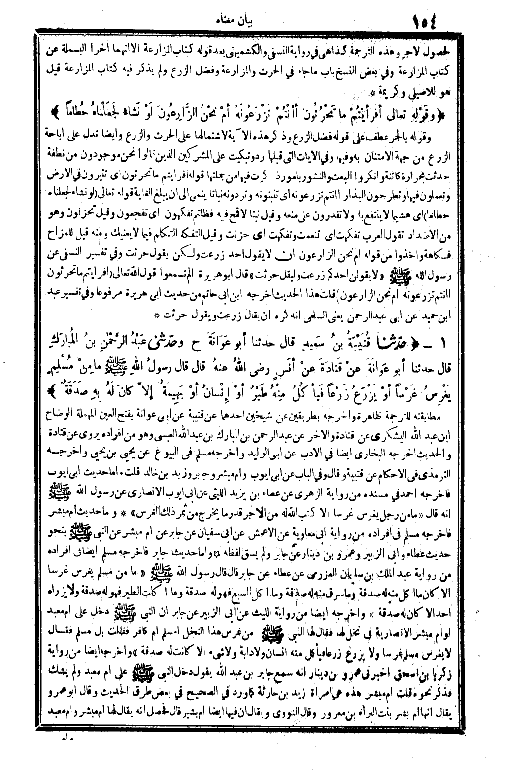 وَقَالَ: وَفِي الْبَاب عَن أبي أَيُّوب، وَأم مُبشر، وَجَابِر، وَزيد بن خَالِد. قلت: أما حَدِيث: أبي أَيُّوب فَأخْرجهُ أَحْمد فِي (مُسْنده) من رِوَايَة الزُّهْرِيّ عَن عَطاء بن يزِيد اللَّيْثِيّ عَن أبي أَيُّوب الْأنْصَارِيّ عَن رَسُول الله صلى الله عَلَيْهِ وَسلم أَنه قَالَ: (مَا من رجل يغْرس غرساً إلاَّ كتب الله لَهُ من الْأجر قدر مَا يخرج من ثَمَر ذَلِك الْغَرْس) . وَأما حَدِيث أم مُبشر فَأخْرجهُ مُسلم فِي أَفْرَاده من رِوَايَة أبي مُعَاوِيَة عَن الْأَعْمَش عَن أبي سُفْيَان عَن جَابر عَن أم مُبشر عَن النَّبِي صلى الله عَلَيْهِ وَسلم بِنَحْوِ حَدِيث عَطاء، وَأبي الزبير وَعَمْرو بن دِينَار عَن جَابر، وَلم يسق لَفظه. وَأما حَدِيث جَابر فَأخْرجهُ مُسلم أَيْضا فِي أَفْرَاده من رِوَايَة عبد الْملك بن سُلَيْمَان الْعَزْرَمِي عَن عَطاء عَن جَابر، قَالَ: قَالَ رَسُول للهلله صلى الله عَلَيْهِ وَسلم: (مَا من مُسلم يغْرس غرسا إلاَّ كَانَ مَا أكل مِنْهُ لَهُ صَدَقَة، وَمَا سرق مِنْهُ لَهُ صَدَقَة، وَمَا أكل السَّبع فَهُوَ لَهُ صَدَقَة، وَمَا أكلت الطير فَهُوَ لَهُ صَدَقَة، وَلَا يزراه أحدا إلاَّ كَانَ لَهُ صَدَقَة) . وَأخرجه أَيْضا من رِوَايَة اللَّيْث عَن أبي الزبير عَن جَابر: أَن النَّبِي صلى الله عَلَيْهِ وَسلم دخل على أم معبد