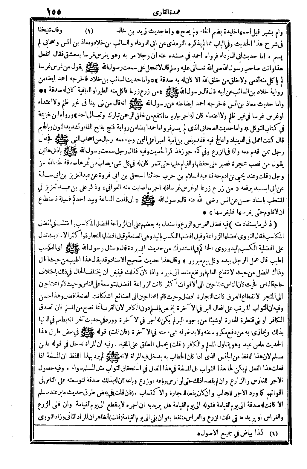 أَو أم مُبشر الْأَنْصَارِيَّة فِي نخل لَهَا، فَقَالَ لَهَا النَّبِي صلى الله عَلَيْهِ وَسلم: (من غرس هَذَا النّخل أمسلم أم كَافِر؟ فَقَالَت: بل مُسلم، فَقَالَ: (لَا يغْرس مُسلم غرساً، وَلَا يزرع زرعا فيأكل مِنْهُ إنس ان وَلَا دَابَّة وَلَا شَيْء إلاَّ كَانَت لَهُ صَدَقَة) . وَأخرجه أَيْضا من رِوَايَة زَكَرِيَّا بن إِسْحَاق أَخْبرنِي عَمْرو بن دِينَار أَنه سمع جَابر بن عبد الله، يَقُول: دخل النَّبِي صلى الله عَلَيْهِ وَسلم على أم معبد وَلم يشك، فَذكر نَحوه، قلت: أم مُبشر هَذِه هِيَ امْرَأَة زيد بن حَارِثَة، كَمَا ورد فِي (الصَّحِيح) فِي بعض طرق الحَدِيث، وَقَالَ أَبُو عَمْرو: يُقَال: إِنَّهَا أم بشر بنت البرار بن معْرور، وَقَالَ النَّوَوِيّ: وَيُقَال: إِن فِيهَا أَيْضا أم بشير، قَالَ: فَحصل أَنه يُقَال لَهَا أم مُبشر وَأم معبد وَأم بشير، قيل: اسْمهَا خليدة، بِضَم الْخَاء وَلم يَصح. وَأما حَدِيث زيد بن خَالِد ... . .